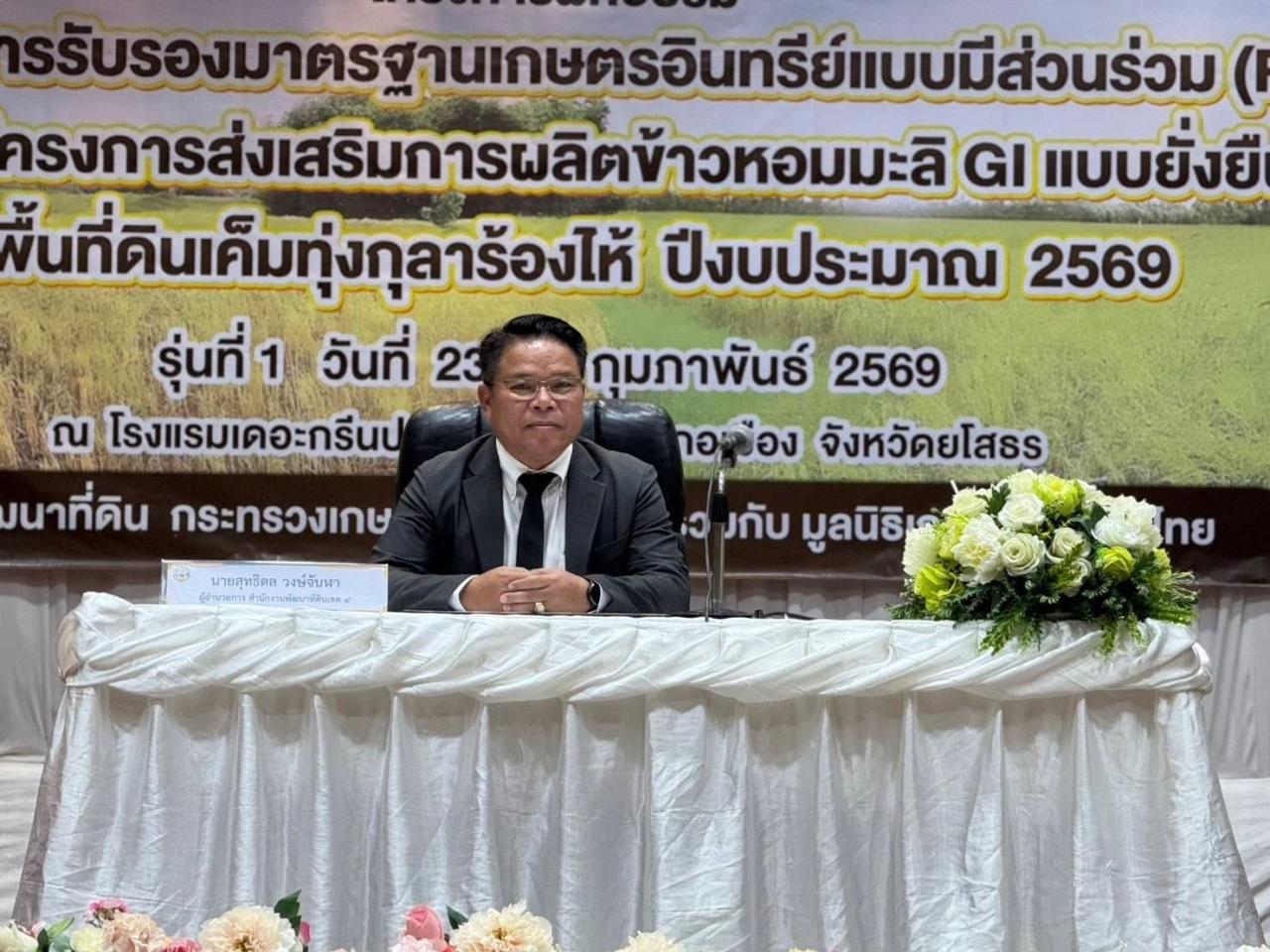 นายสุทธิดล วงษ์จันฬา ผู้อำนวยการสำนักงานพัฒนาที่ดินเขต 4 เป็นประธานเปิดโครงการฝึกอบรม หลักสูตร “ระบบรับรองมาตรฐานเกษตรอินทรีย์แบบมีส่วนร่วม (PGS)” รุ่นที่ 1 ภายใต้โครงการส่งเสริมการผลิตข้าวหอมมะลิ GI แบบยั่งยืนในพื้นที่ดินเค็มทุ่งกุลาร้องไห้ ปีงบประมาณ 2569 ณ โรงแรม เดอะกรีนปาร์ค แกรนด์ ตำบลในเมือง อำเภอเมืองยโสธร จังหวัดยโสธร