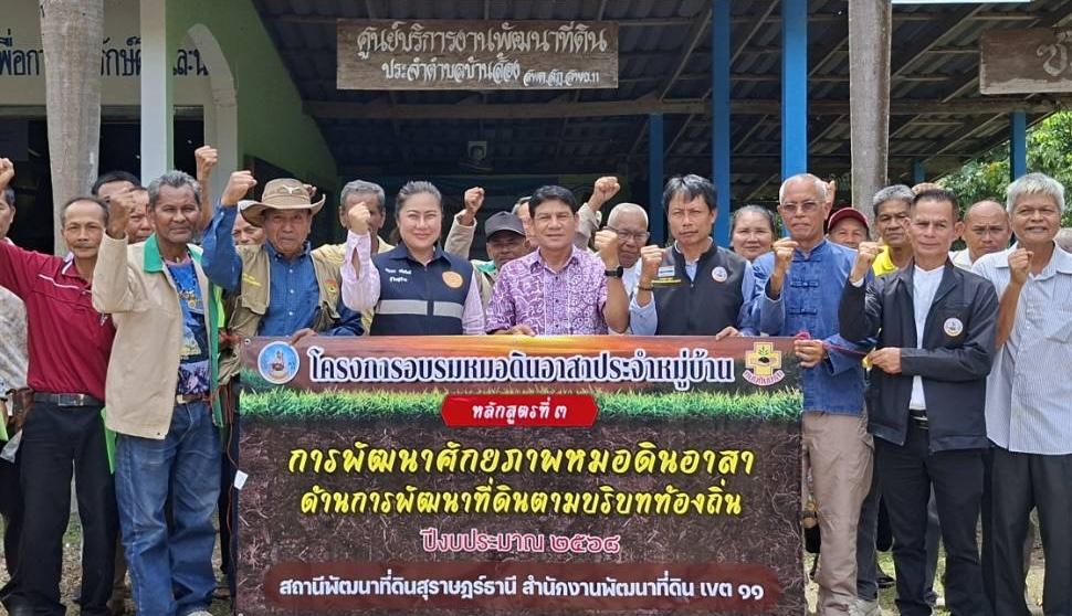 วันอังคารที่ 17 มิถุนายน 2568 เวลา09.30น. สถานีพัฒนาที่ดินสุราษฎร์ธานี จัดโครงการอบรมหมอดินอาสา หลักสูตรที่ 3 "การพัฒนาศักยภาพของหมอดินอาสาด้านการพัฒนาที่ดินตามบริบทท้องถิ่น" ประจำปีงบประมาณ 2568 โดยมีนายสุชล แก้วเกาะสะบ้า ผู้อำนวยการสำนักงานพัฒนาที่ดินเขต 11 เป็นประธานเปิดการอบรมฯ และนายสุรเชนทร์ แพเพชรทอง หัวหน้าฝ่ายวิชาการเพื่อการพัฒนาที่ดินที่ 2 สถานีพัฒนาที่ดินสุราษฎร์ธานี กล่าวรายงานถึงวัตถุประสงค์การจัดอบรมฯ เพื่อให้หมอดินอาสานำองค์ความรู้ด้านการพัฒนาที่ดิน ในด้านต่างๆที่เหมาะสมตามบริบทปัญหาของพื้นที่ ไปใช้ประโยชน์เพื่อการพัฒนาการเกษตรของหมอดินอาสาได้อย่างเกิดผลสูงสุด โดยมีนายนพพล ถมทอง ผู้อำนวยการสถานีพัฒนาที่ดินสุราษฎร์ธานี นางเจตณี บัวเผียน ผู้อำนวยการกลุ่มวางแผนการใช้ที่ดิน ข้าราชการและเจ้าหน้าที่ ร่วมพิธีเปิดฯ ซึ่งมีหมอดินอาสาเข้าร่วมอบรมจำนวน 65 ราย ณ ศูนย์ฝึกปฏิบัติด้านการพัฒนาที่ดิน ตำบลบ้านส้อง อำเภอเวียงสระ จังหวัดสุราษฎร์ธานี