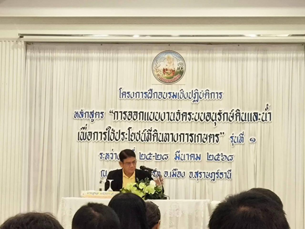 ทั้งนี้ได้รับเกียรติวิทยากรจาก ดร.พิทยากร ลิ่มทอง อดีตผู้เชี่ยวชาญด้านอนุรักษ์ดินและน้ำ นายธีระพล วงษ์ประยูร ผอ.ส่วนมาตรฐานและคลังธรณีวิทยา กรมทรัพยากรธรณี นายปรัชญา ฉายวัฒนา ผู้เชี่ยวชาญด้านวิศวกรรมโยธา (ด้านการวางแผน) กรมชลประทาน ผู้เชี่ยวชาญ และผู้อำนวยการ จากส่วนกลาง และส่วนภูมิภาคกรมพัฒนาที่ดิน เป็นวิทยากรตลอดหลักสูตร ณ โรงแรมแก้วสมุย จ.สุราษฎร์ธานี