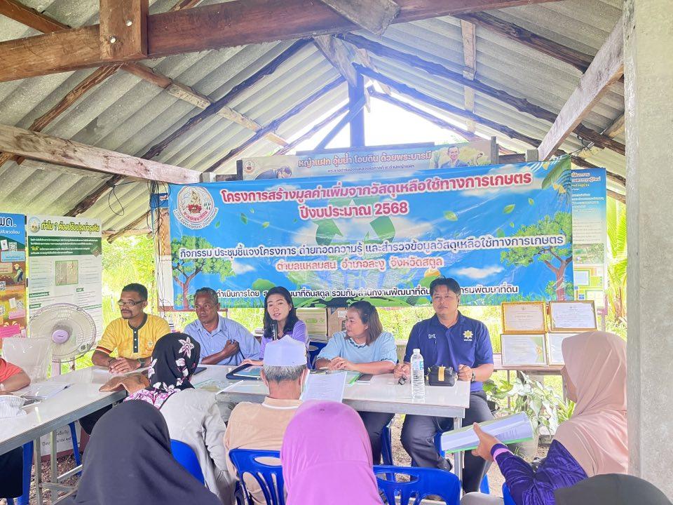 วันที่ 15 กรกฎาคม 2568 นักวิชาการเกษตรกลุ่มวิชาการเพื่อการพัฒนาที่ดิน ร่วมกับสถานีพัฒนาที่ดินสตูล จังหวัดสตูล ลงพื้นที่บ้านกาแบง ตำบลแหลมสน อำเภอละงู จังหวัดสตูล กิจกรรมประชุมชี้แจงโครงการ ถ่ายทอดความรู้ และสำรวจข้อมูลวัสดุเหลือใช้ทางการเกษตร ในโครงการสร้างมูลค่าเพิ่มจากวัสดุเหลือใช้ทางการเกษตร ปีงบประมาณ 2568 เพื่อเก็บข้อมูลด้านเศรษฐกิจและสังคม แนวทางการสร้างมูลค่าเพิ่มวัสดุเหลือใช้ที่หลากหลาย ทั้งภาคเกษตร อุตสาหกรรม และประมง เพื่อให้สามารถนำวัสดุเหลือใช้ทางการเกษตรนำกลับมาใช้ประโยชน์ได้