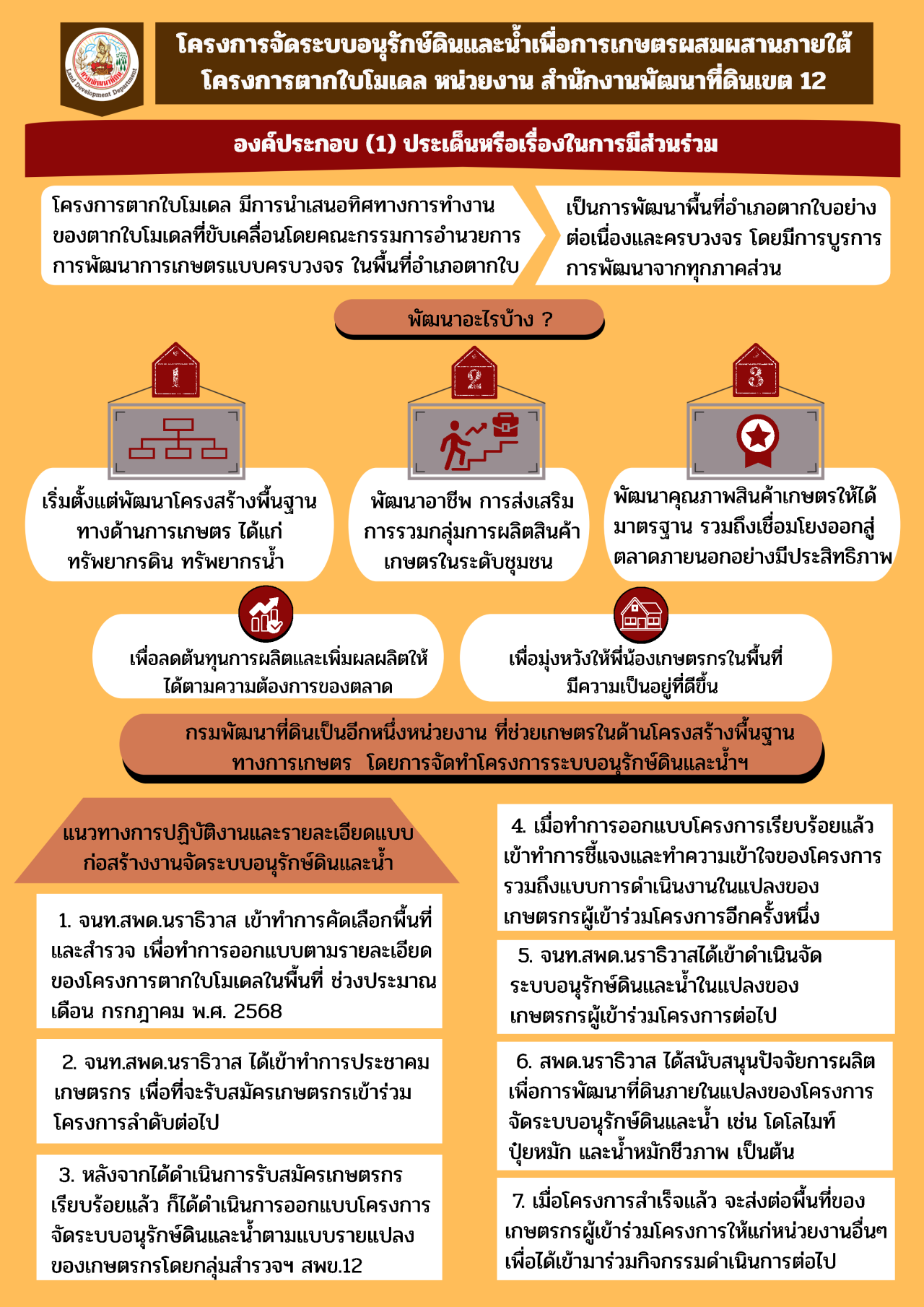 สำนักงานพัฒนาที่ดินเขต 12 ขอเผยแพร่สื่ออินโฟกราฟฟิก (Infographic) ผลการดำเนินการเปิดโอกาสให้บุคคลภายนอกได้มีส่วนร่วมในการดำเนินงานตามภารกิจของกรมพัฒนาที่ดิน ประจำปีงบประมาณ พ.ศ. 2569 โครงการจัดระบบอนุรักษ์ดินและน้ำเพื่อการเกษตรผสมผสานภายใต้โครงการตากใบโมเดล ซึ่งดำเนินโครงการโดยสถานีพัฒนาที่ดินนราธิวาส