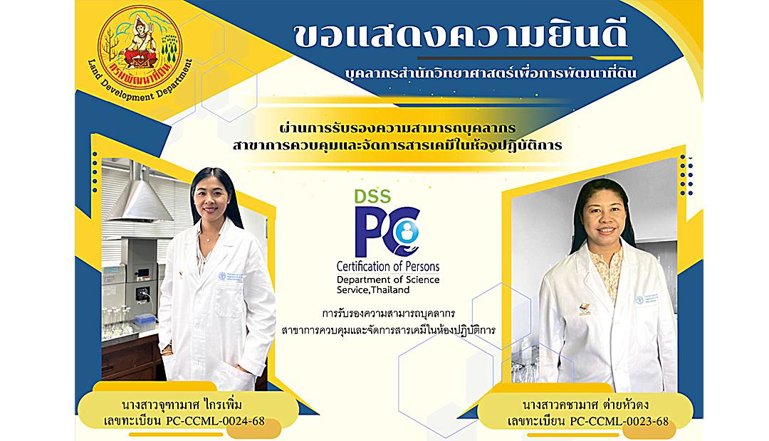นักวิทยาศาสตร์ประจำกลุ่มวิจัยเคมีดินของ สวด. ที่สอบผ่านและได้รับการรับรองความสามารถบุคลากร สาขาการควบคุมและจัดการสารเคมีในห้องปฏิบัติการ ครั้งที่ 1/2568 ตามมาตรฐานสากล ISO/IEC 17024 จาก สถาบันพัฒนานักวิทยาศาสตร์ กรมวิทยาศาสตร์บริการ (วศ.)