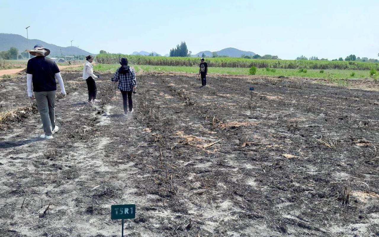 นักวิจัยลงพื้นที่เก็บตัวอย่างดิน โครงการวิจัย "พลวัตของธาตุอาหารและการเปลี่ยนแปลงของสัตว์ในดินในพื้นที่ปลูกพืชเศรษฐกิจภายใต้การเผาเศษพืชกับจัดการเศษพืชในแปลงปลูก" จังหวัดราชบุรี