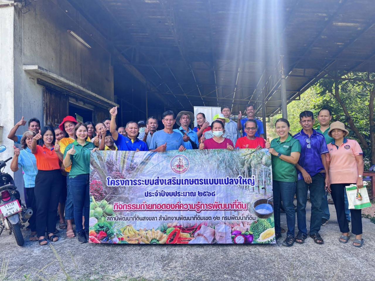 วันที่ 8 พฤษภาคม 2568 นายวีระพจน์ เรืองมี ผู้อำนวยการสถานีพัฒนาที่ดินสงขลา มอบหมายให้นางสาวรัตนา แก้วประดับเพชร นักวิชาการเกษตรปฏิบัติการ พร้อมด้วยเจ้าหน้าที่ จัดอบรมกิจกรรมถ่ายทอดองค์ความรู้ด้านการพัฒนาที่ดิน ให้แก่เกษตรกรภายใต้โครงการระบบส่งเสริมเกษตรแบบแปลงใหญ่ (ยางพารา) ตำบลเกาะใหญ่ อำเภอกระแสสินธุ์ จังหวัดสงขลา เพื่อส่งเสริมให้เกษตรกรที่เข้าร่วมกลุ่มเกษตรแปลงใหญ่ มีความรู้ในการตรวจวิเคราะห์ดินเพื่อการเกษตร การจัดการดินและปุ๋ย สามารถใช้ปุ๋ยตามค่าวิเคราะห์ดินได้อย่างแม่นยำ พร้อมทั้งสาธิตการผลิตน้ำหมักชีวภาพ พด.2 เพื่อช่วยลดต้นทุนการผลิตให้กับเกษตรกรต่อไป