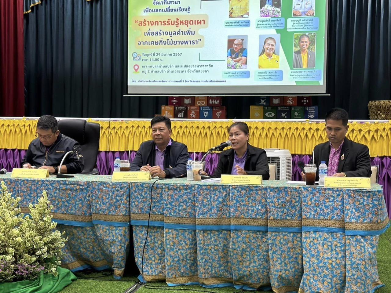 วันที่29 มี.ค. 2567 สถานีพัฒนาที่ดินสงขลา โดยนางอารีย์ สวนแก้ว นักวิชาการเกษตรชำนาญการ ได้เข้าร่วม จัดเวทีเสวนาเพื่อแลกเปลี่ยนความรู้ ในหัวข้อ "สร้างการรับรู้หยุดเผาเพื่อสร้างมูลค่าเพิ่มจากเศษกิ่งไม้ยางพารา" มีหน่วยงานภาครัฐ เอกชน และเกษตรกรในชุมชน เข้ามาแลกเปลี่ยนความรู้ ณ เทศบาลตำบลปริก ม.2 ต.ปริก อำเภอสะเดา จ.สงขลา