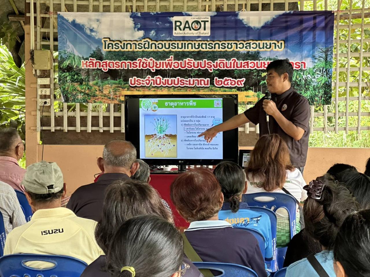 วันอังคารที่ 18 พฤศจิกายน พ.ศ. 2568 นายธรรมรัฐ พุทธะสุภะ ผู้อำนวยการสถานีพัฒนาที่ดินสงขลา มอบหมายให้นายอภิชัย ศรีชัย นักวิชาการเกษตรปฏิบัติการ และนางเกษณี สุคันธพันธ์ นักวิชาการเกษตร ร่วมเป็นวิทยากรถ่ายทอดองค์ความรู้เทคโนโลยีการพัฒนาที่ดิน “โครงการฝึกอบรมเกษตรกรชาวสวนยาง หลักสูตรการใช้ปุ๋ยเพื่อปรับปรุงบำรุงดินในสวนยางพารา” เพื่อให้เกษตรกรได้ทราบถึงความสำคัญในการใช้ปุ๋ยเพื่อปรับปรุงบำรุงดินในสวนยางพารา เกิดการลดต้นทุนการผลิตและการบริหารจัดการดินอย่างถูกวิธี สร้างความเข้มแข็งให้กับเกษตรกรชาวสวนยางพาราในพื้นที่ความรับผิดชอบของการยางแห่งประเทศไทย ณ สวนครูยูรหนำคอก หมู่ที่ 6 ตำบลท่าโพธิ์ อำเภอสะเดา จังหวัดสงขลา