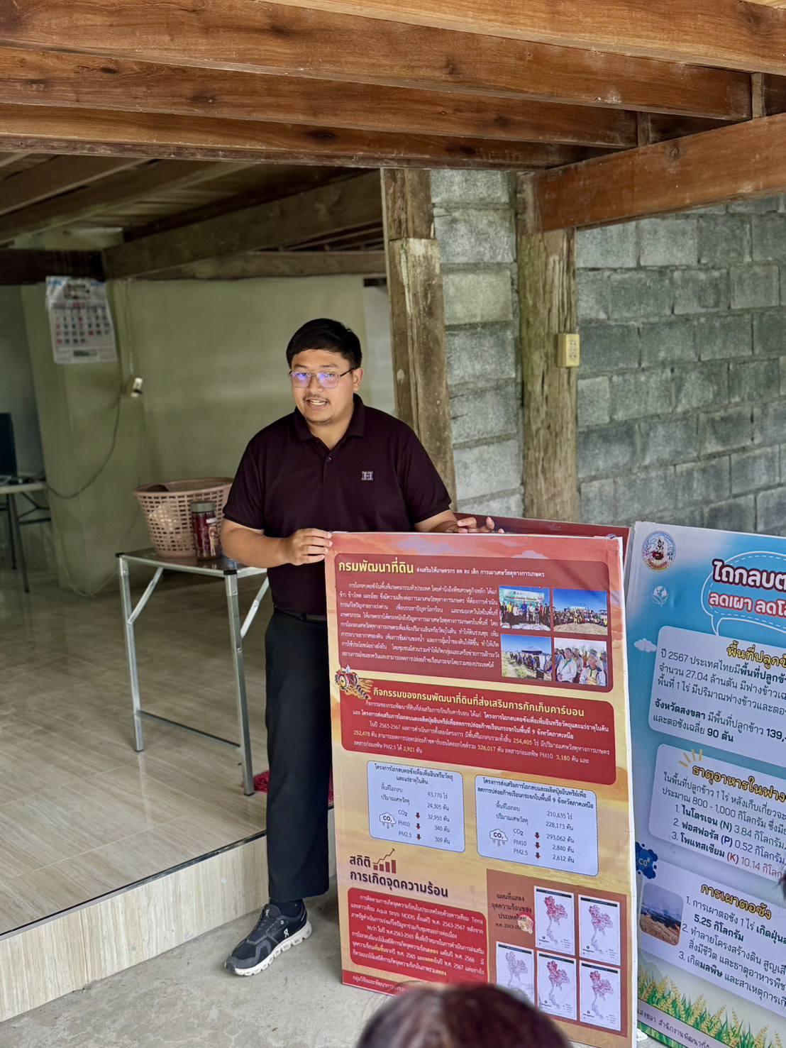 วันศุกร์ที่ 9 มกราคม 2569 นายธรรมรัฐ พุทธะสุภะ ผู้อำนวยการสถานีพัฒนาที่ดินสงขลา มอบหมายให้นายธีรพจน์ ทองเหล่ นักวิชาการเกษตรชำนาญการ พร้อมด้วย นายอัญชนะ วิจะสิกะ นักวิชาการเกษตร ลงพื้นที่ติดตามงานโครงการผลิตทุเรียนตามระบบการเกษตรปลอดภัย เพื่อติดตามการดำเนินโครงการ พร้อมทั้งร่วมปรึกษาและให้คำแนะนำแก่เกษตรกรในการจัดการแปลงทุเรียนหลังประสบภัยพิบัตน้ำท่วม และร่วมรณรงค์ โครงการลดการเผาในพื้นที่เกษตร ซึ่งเป็นนโยบายสำคัญของรัฐบาล โดยเน้นการส่งเสริมให้เกษตรกรปรับเปลี่ยนพฤติกรรม งดการเผาวัสดุทางการเกษตร และหันมาใช้แนวทางที่เป็นมิตรต่อสิ่งแวดล้อม อาทิ การไถกลบตอซัง การทำปุ๋ยหมัก หรือการนำวัสดุเหลือใช้ทางการเกษตรไปใช้ประโยชน์ในรูปแบบอื่น ณ บ้านป่ากล้วย ตำบลฉลุง อำเภอหาดใหญ่ จังหวัดสงขลา