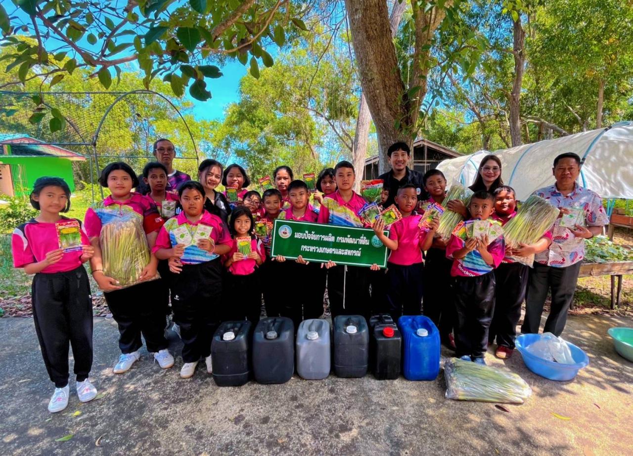 วันพุธ ที่ 4 กุมภาพันธ์ 2569 นายธรรมรัฐ พุทธะสุภะ ผู้อำนวยการสถานีพัฒนาที่ดินสงขลา มอบหมายให้นางสาวธภัทร ทองไหม นักวิชาการเกษตร พร้อมด้วยนายเจษฎา โพธิ์เพชร นักวิชาการเกษตร ลงพื้นที่สนับสนุนปัจจัยการผลิตด้านการเกษตร และสาธิตการผลิตสารไล่แมลงจากสารเร่งซุปเปอร์พด.7 ปีงบประมาณ 2569 ณ โรงเรียนชุมชนบ้านบ่อประดู่ หมู่ที่ 3 ตำบลวัดจันทร์ อำเภอสทิงพระ จังหวัดสงขลา