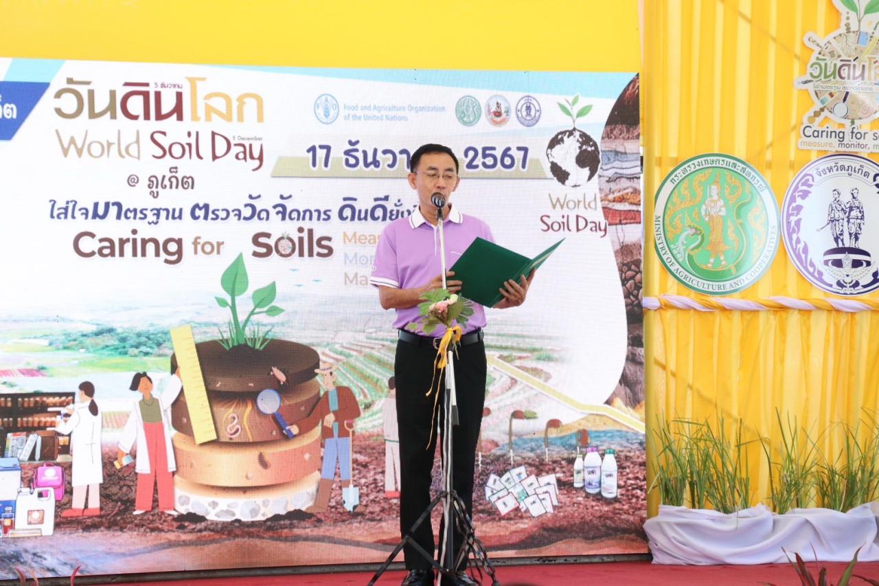 วันที่ 17 ธันวาคม 2567 สถานีพัฒนาที่ดินภูเก็ต นำโดย นายทรงวุฒิ แสงสุริยะ ผู้อำนวยการสถานีพัฒนาที่ดินภูเก็ต จัดงานวันดินโลก ประจำปี 2567 ภายใต้หัวข้อ Caring for soils : Measure, Monitor, Manage ใส่ใจมาตรฐาน ตรวจวัดจัดการ ดินดียั่งยืน โดยมีนายรณรงค์ ทิพย์ศิริ รองผู้ว่าราชการจังหวัดภูเก็ต เป็นประธานเปิดงาน วันดินโลก ปี 2567 โดยมีหัวหน้าส่วนราชการจังหวัดภูเก็ต พร้อมหมอดินอาสาเข้าร่วมงาน กว่า 250 ราย ณ สถานีพัฒนาที่ดินภูเก็ต หมู่ที่ 8 ตำบลศรีสุนทร อำเภอถลาง จังหวัดภูเก็ต