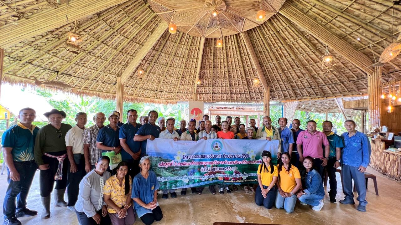 วันที่ 7 พฤษภาคม 2568 นายธรรมรัฐ พุทธะสุภะ ผู้อำนวยการสถานีพัฒนาที่ดินกระบี่ พร้อมด้วยนายอุชุกร พรหมมานนท์ นักวิชาการเกษตรชำนาญการพิเศษ และฝ่ายวิชาการเพื่อการพัฒนาที่ดิน ดำเนินการจัดฝึกอบรมหมอดินอาสา หลักสูตร 3 การพัฒนาศักยภาพของหมอดินอาสาด้านการพัฒนาที่ดินตามบริบทท้องถิ่นประจำปี 2568 พื้นที่อำเภอเหนือคลอง อำเภอคลองท่อม อำเภอเกาะลันตา จังหวัดกระบี่ จำนวน 68 ราย โดยมีการบรรยายองค์ความรู้แนวทางการจัดการดินและปุ๋ยในสวนยางยั่งยืนของนายบุญส่ง นับทอง เกษตรกรผู้ปลูกยางพาราด้วยระบบวนเกษตร อีกทั้งศึกษาฐานเรียนรู้ จำนวน 8 ฐาน ได้แก่ 1. แนวคิดการทำสวนยางยั่งยืน 2. ทำไมต้องปลูกยางพาราระยะปลูก 12 x 3 เมตร 3. ทำยังไงต้นยางจึงโตไวและได้ผลผลิตสูงเท่าหรือมากกว่าสวนยางปกติทั้งที่ปลูกยางจำนวนน้อยต้นกว่า 4. วิธีการปลูกไผ่ในสวนยาง 5. ไม้เศรษฐกิจโตเร็วในสวนยาง 6. ไม้ผลและผึ้งชันโรงในสวนยาง 7. ไม้สัก ขนุน จำปาดะ ในสวนยาง 8. ทุเรียนอินทรีย์ในสวนยางพารา และการฝึกอบรมหมอดินหลักสูตร 3 ยังเป็นเวทีแสดงความคิดเห็นแลกเปลี่ยนเรียนรู้การแก้ปัญหาดินจากประสบการณ์ในการทำการเกษตรของตนเองตามบริบทภูมิสังคมของหมอดินอาสาจังหวัดกระบี่
