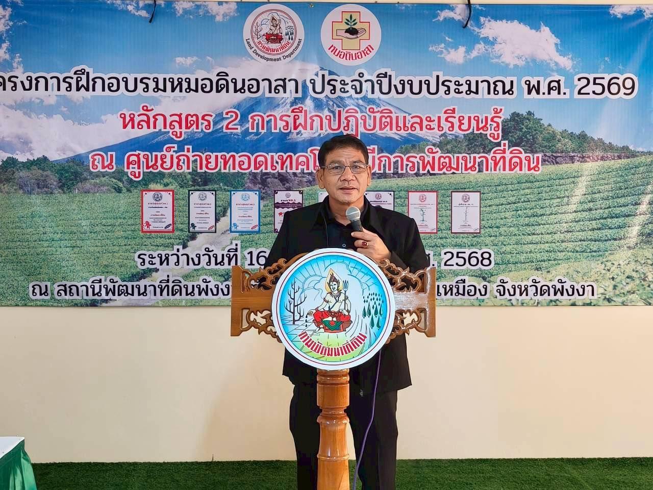 วันอังคารที่ 16 ธันวาคม 2568 เวลา 09.00 น. นายปัญญา ใจสมุทร ผู้อำนวยการสถานีพัฒนาที่ดินพังงา พร้อมด้วยเจ้าหน้าที่ จัดฝึกอบรมหมอดินอาสา ประจำปีงบประมาณ 2569 หลักสูตรที่ 2 การฝึกปฏิบัติและเรียนรู้ โดยมีนายสุชล แก้วเกาะสะบ้า ผู้อำนวยการสำนักงานพัฒนาที่ดินเขต 11 เป็นประธานเปิดการฝึกอบรมโครงการอบรมหมอดินอาสา กรมพัฒนาที่ดิน ประจำปีงบประมาณ 2569 หลักสูตรที่ 2 การฝึกปฏิบัติและเรียนรู้ วัตถุประสงค์การจัดโครงการอบรมในครั้งนี้ เพื่อให้หมอดินอาสาได้เรียนรู้เทคโนโลยีในการพัฒนาที่ดินที่เหมาะสมกับสภาพพื้นที่ พร้อมมีส่วนร่วมในการแสดงความคิดเห็น แลกเปลี่ยนความรู้การแก้ปัญหาด้านดินจากประสบการณ์ในการทำการเกษตรของตนเอง สามารถสร้างเครือข่าย สาขาอาชีพต่าง ๆ หมอดินอาสา และจัดทำต้นแบบหมอดินอาสาในการแก้ไขปัญหาดินต่าง ๆ ได้อย่างมีประสิทธิภาพ ซึ่งมีหมอดินเข้ารับการฝึกอบรม จำนวน 48 ราย ณ ศูนย์ถ่ายทอดเทคโนโลยีการพัฒนาที่ดิน สถานีพัฒนาที่ดินพังงา ตำบลนาเตย อำเภอท้ายเหมือง จังหวัดพังงา