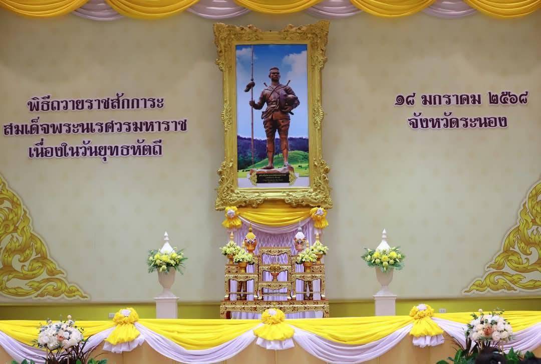 โดยนายสุพจน์ ภูติเกียรติขจร ผู้ว่าราชการจังหวัดระนอง ถวายความเคารพเบื้องหน้าพระบรมฉายาลักษณ์ สมเด็จพระนเรศวรมหาราช ก่อนจะถวายพานพุ่มดอกไม้สด หน้าโต๊ะหมู่บูชาเบื้องหน้าพระบรมฉายาลักษณ์ และจุดเครื่องทองน้อย จากนั้นกล่าวถวายราชสดุดีเนื่องในวันยุทธหัตถีของสมเด็จพระนเรศวรมหาราช วันประวัติศาสตร์สำคัญ ที่สมเด็จพระนเรศวรมหาราช ทรงได้รับชัยชนะ จากการทำยุทธหัตถีกับพระมหาอุปราชา พสกนิกรชาวจังหวัดระนองทุกหมู่เหล่า ต่างสำนึกในพระมหากรุณาธิคุณอันยิ่งใหญ่ ที่ทรงกอบกู้เอกราชของชาติไทย และทรงสถาปนาความเข้มแข็งมั่นคง แก่ประเทศไทยมาในอดีตกาล อันนำซึ่งความสุขสงบ และเกียรติภูมิของราชอาณาจักร มาถึงกาลปัจจุบัน ณ ห้องประชุมคอซู้เจียง ศูนย์ราชการจังหวัดระนอง