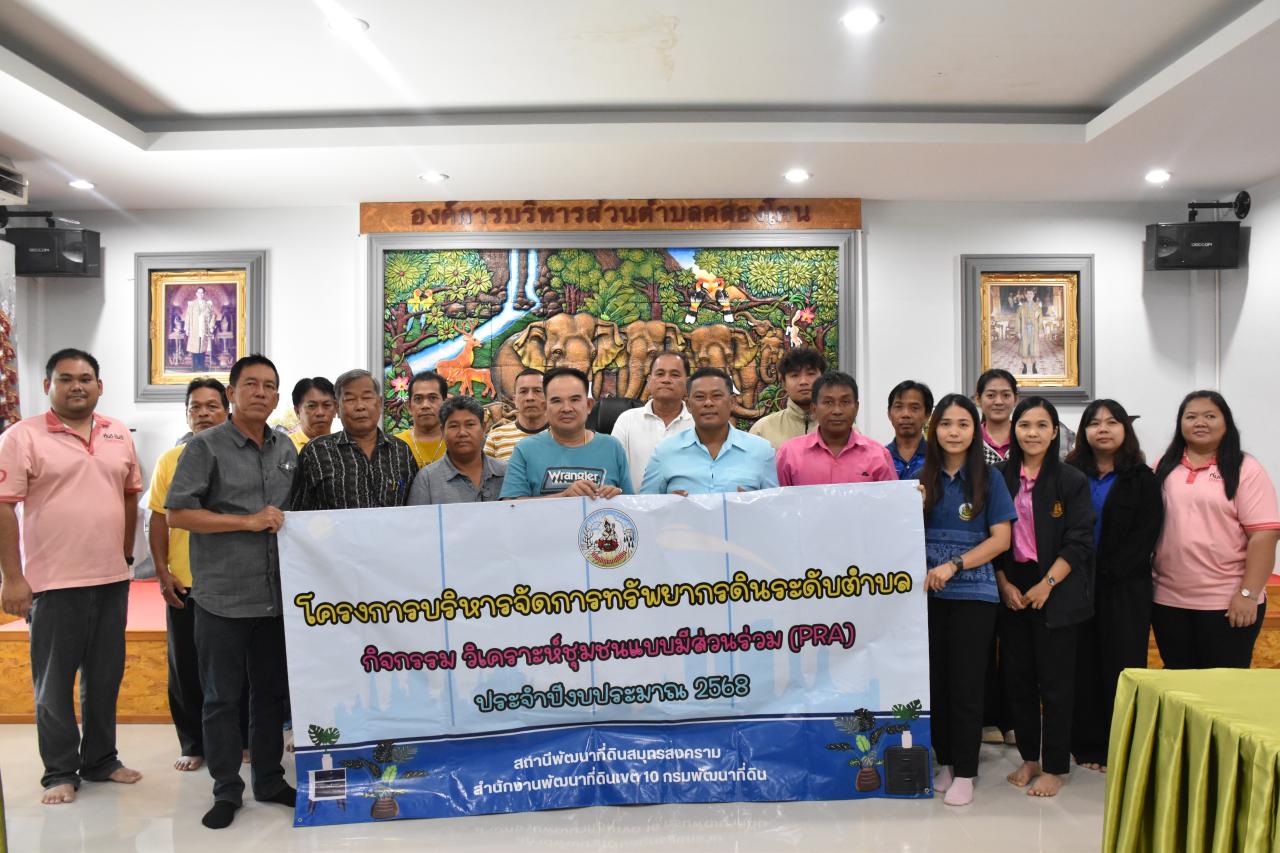 วันอังคารที่ 24 มิถุนายน 2568 นายธิเบต คงนาวัง ผู้อำนวยการสถานีพัฒนาที่ดินสมุทรสงคราม มอบหมายให้นางสาวกัญณัฎฐ์ สุขสว่าง นักวิชาการเกษตรปฏิบัติการ และเจ้าหน้าที่สถานีพัฒนาที่ดินสมุทรสงคราม ร่วมกับองค์การบริหารส่วนตำบลคลองโคน หน่วยงานราชการที่เกี่ยวข้อง ผู้นำชุมชน หมอดินอาสาและเกษตรกร ดำเนินการจัดทำแผนการใช้ที่ดินระดับตำบล ประจำปี 2568 ผ่านกระบวนการวิเคราะห์ชุมชนแบบมีส่วนร่วม (Participatory Rural Appraisal : PRA) เพื่อรับฟังความคิดเห็น ข้อเสนอแนะ ปัญหา และความต้องการของชุมชนในประเด็นต่างๆ เพื่อนำมาจัดทำแผนการใช้ที่ดินระดับตำบลคลองโคน ในการวางแผนการใช้ที่ดินให้เหมาะสมกับสภาพพื้นที่ และศักยภาพของที่ดิน เพื่อให้เกิดประโยชน์สูงสุดและยั่งยืน ณ ห้องประชุมองค์การบริหารส่วนตำบลคลองโคน อำเภอเมือง จังหวัดสมุทรสงคราม