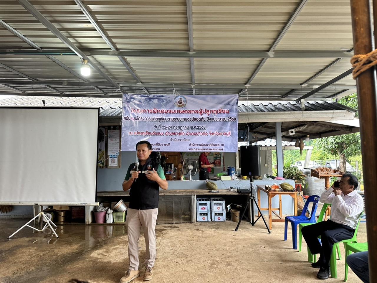 เมื่อวันที่ 22 กรกฎาคม 2568 นายธิเบต คงนาวัง ผู้อำนวยการสถานีพัฒนาที่ดินสมุทรสงคราม ร่วมเป็นวิทยากรในโครงการฝึกอบรมเกษตรกรผู้ปลูกทุเรียน หลักสูตร การขยายผลเกษตรกรผู้ผลิตทุเรียนตามระบบเกษตรปลอดภัย ณ แปลงต้นแบบทุเรียน หมู่ 6 ตำบลยางหัก อำเภอปากท่อ จังหวัดราชบุรี โดยให้ความรู้และแนวทางการดำเนินงานโครงการผลิตทุเรียนตามระบบเกษตรปลอดภัย
