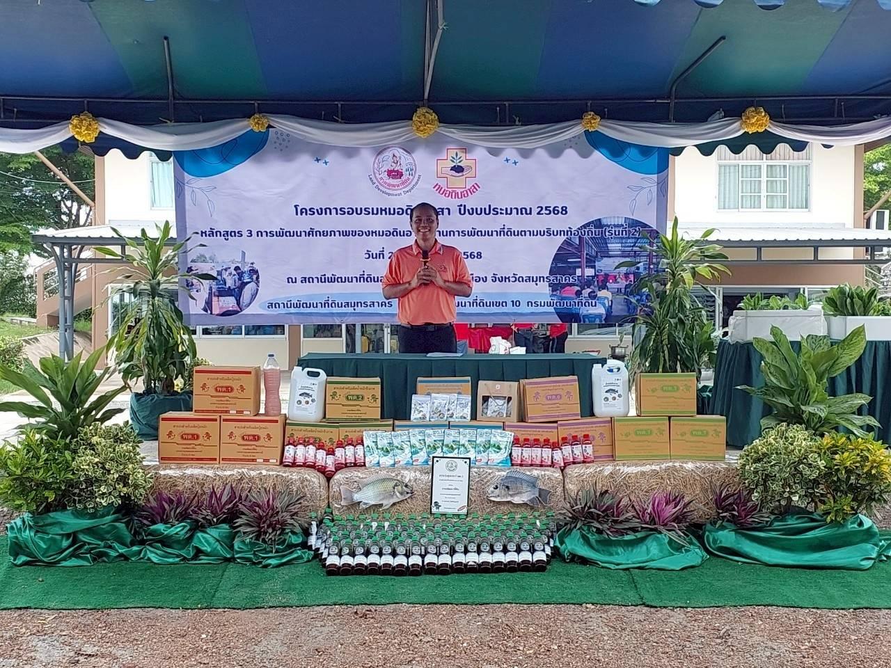 วันที่ 27 พฤษภาคม 2568 เวลา 9.30 น. สถานีพัฒนาที่ดินสมุทรสาคร ได้จัดอบรมหมอดินอาสา หลักสูตร 3 การพัฒนาศักยภาพหมอดินอาสาด้านการเกษตรตามบริบทท้องถิ่น (รุ่นที่2) โดยมีนายธนัชกฤต กลิ่นหวล ผอ.สพด.สมุทรสาคร ได้กล่าวเปิดงานและวัตถุประสงค์ในฝึกอบรม ซึ่งในการอบรมได้มีการสาธิตและแลกเปลี่ยนเรียนรู้ เกี่ยวกับการควบคุมศัตรูพืชในมะพร้าว, การทำเกษตรเขตเมือง ,การใช้ พด.15 แบคทีเรียสังเคราะห์แสง ส่งเสริมการเจริญเติบโตของพืช และการผลิตน้ำหมักชีวภาพสูตรปลาหมอคางดำ จากสารเร่งซุปเปอร์ พด.2 โดยมีหมอดินอาสาประจำจังหวัด หมอดินอาสาประจำอำเภอ หมอดินอาสาประจำตำบล และหมอดินอาสาประจำหมู่บ้าน เข้าร่วมการอบรมรวม 80 คน