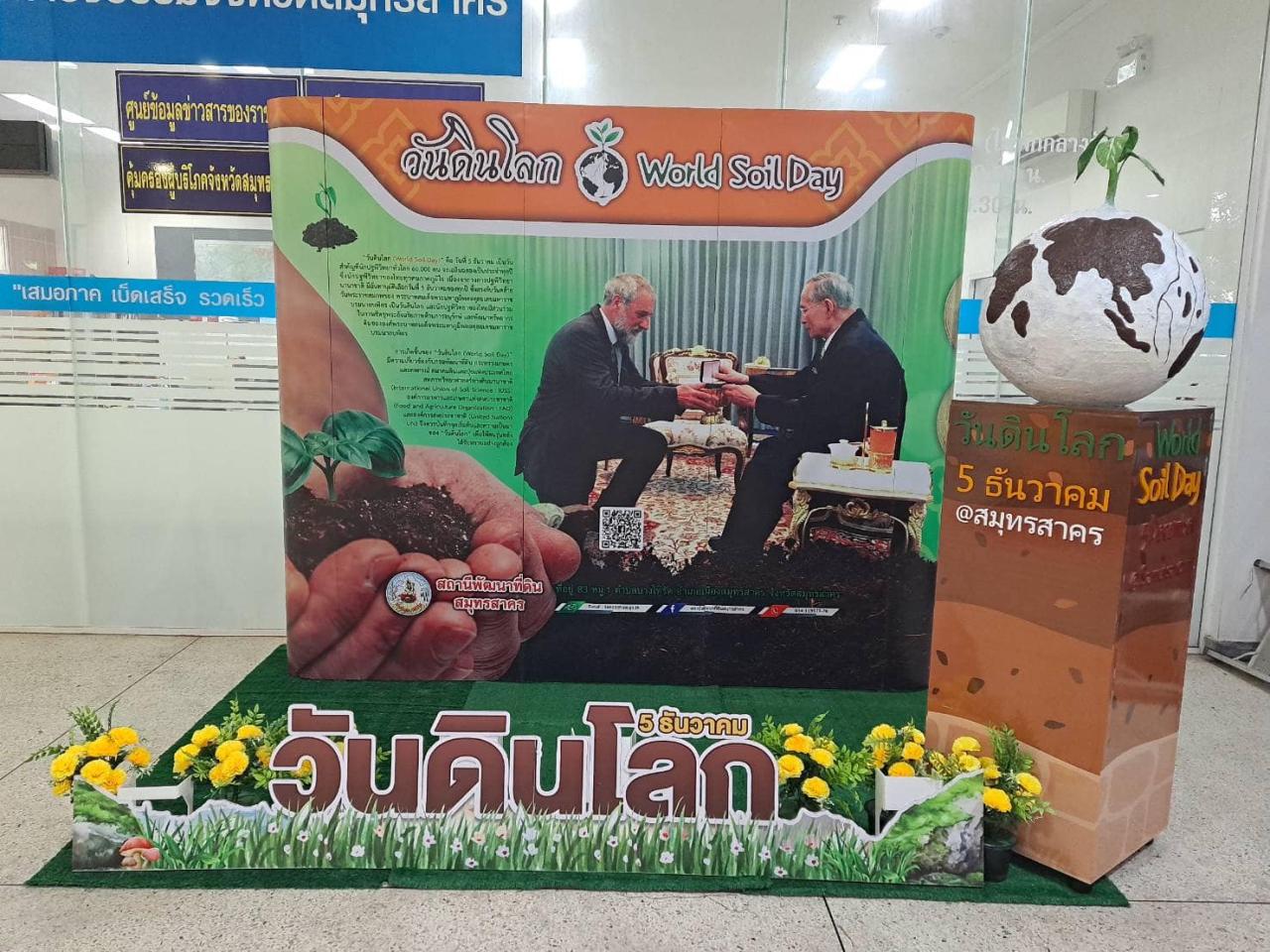 วันอังคารที่ 3 ธันวาคม 2567 สถานีพัฒนาที่ดินสมุทรสาคร จัดนิทรรศการวันดินโลก (World Soil Day) เพื่อสดุดีพระเกียรติคุณ พระบาทสมเด็จพระบรมชนกาธิเบศร มหาภูมิพลอดุลยเดชมหาราช บรมนาถบพิตร ที่ทรงได้รับการถวายรางวัลนักวิทยาศาสตร์ดินเพื่อมนุษยธรรม (The Humanitarian Soil Scientist) ซึ่งเป็นที่ประจักษ์ถึงวิสัยทัศน์และพระราชกรณียกิจเกี่ยวกับการพัฒนาและอนุรักษ์ทรัพยากรดินอย่างยั่งยืน ณ โถงชั้น 1 อาคารศาลากลางหลังใหม่ ศาลากลางจังหวัดสมุทรสาคร