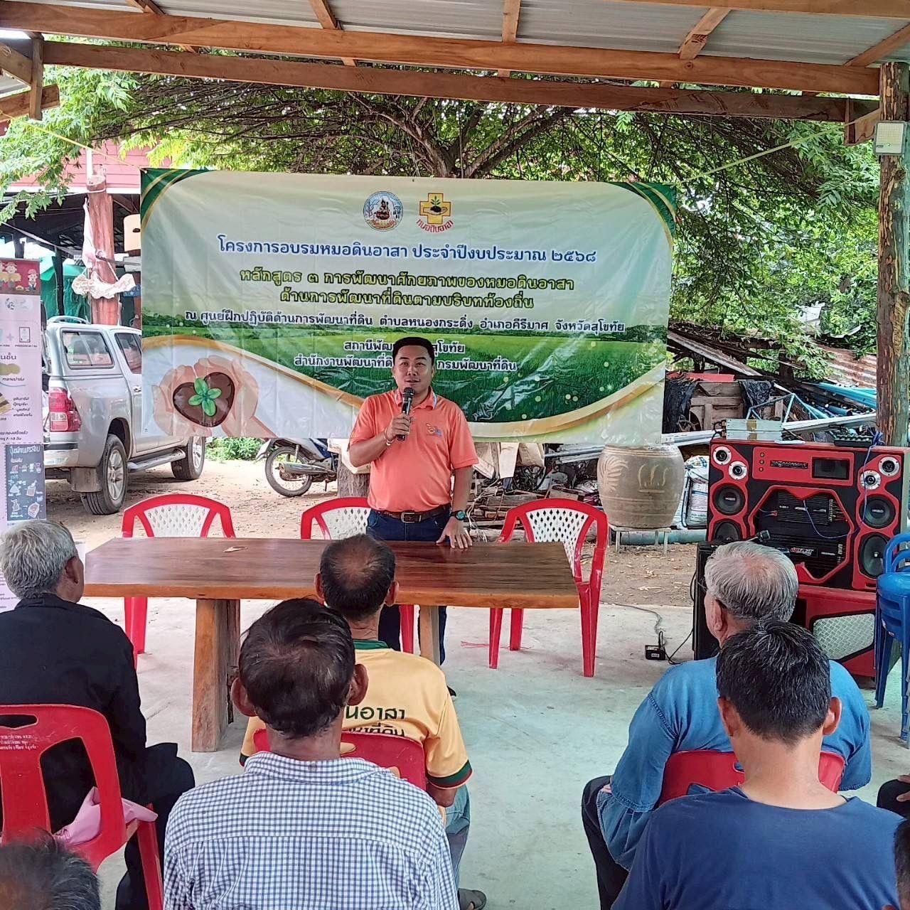 วันพฤหัสบดีที่ 29 พฤษภาคม 2568 นายวิวรรธน์ภูมิ พรอำนวยลาภ ผู้อำนวยการสถานีพัฒนาที่ดินสุโขทัย มอบหมายให้นายมนต์ชัย พรมลอองวัน นักวิชาการเกษตรชำนาญการพิเศษ และเจ้าหน้าที่ ดำเนินโครงการอบรมหมอดินอาสาหลักสูตร 3 การพัฒนาศักยภาพของหมอดินอาสาด้านการพัฒนาที่ดินตามบริบทท้องถิ่น ประจำปีงบประมาณ 2568 โดยจัดอบรมในหัวข้อบทบาทและหน้าที่ของหมอดินอาสา การจัดการดิน น้ำ ปุ๋ย และที่ดินให้ใช้ประโยชน์เพื่อการพัฒนาการเกษตรของตนเอง ผลิตอาหารและสร้างอาชีพได้ และการใช้สารเร่งซุปเปอร์ พด.ต่าง ๆของกรมพัฒนาที่ดิน นอกจากนี้ยังเสริมความรู้ในการรายงานข่าวสารที่เกิดขึ้นในชุมชนของตนเองอย่างถูกต้องและเหมาะสม เพื่อให้เกิดประโยชน์ทั้งต่อตนเอง สังคม และหน่วยงานที่เกี่ยวข้อง โดยมีหน่วยงานจาก กอ.รมน. มาให้ความรู้แก่หมอดินอาสา จำนวน 30 ราย ณ ศูนย์ฝึกปฏิการด้านการพัฒนาที่ดิน ตำบลหนองกระดิ่ง อำเภอคีรีมาศ จังหวัดสุโขทัย