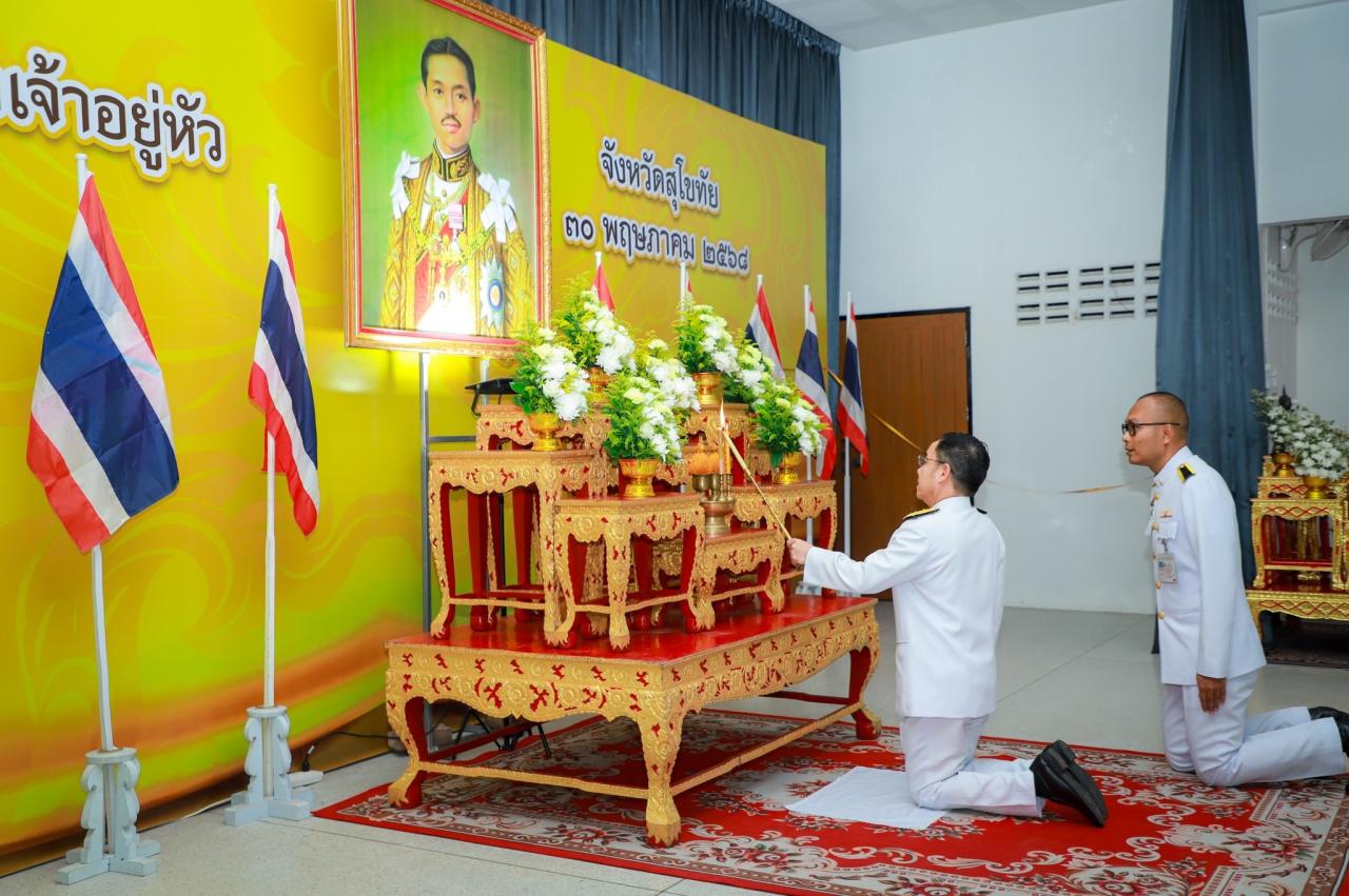 ประธานทอดผ้าไตร จำนวน 10 ไตร พระสงฆ์สดับปกรณ์ (ภูษาโยง) อนุโมทนา/กรวดน้ำ จากนั้นประธานในพิธีวางพวงมาลา ถวายราชสักการะ กล่าวคำถวายราชสดุดี โดยมีนายนพฤทธิ์ ศิริโกศล ผู้ว่าราชการจังหวัดสุโขทัย เป็นประธาน พร้อมกับนายกเหล่ากาชาดจังหวัดสุโขทัย รองผู้ว่าราชการจังหวัดสุโขทัย ศาล ทหาร ตำรวจ อัยการ หัวหน้าส่วนราชการ นายอำเภอ สมาชิกเหล่ากาชาด ข้าราชการ และเจ้าหน้าที่เข้าร่วมในพิธี ณ ศาลาอเนกประสงค์ ศาลากลางจังหวัดสุโขทัย