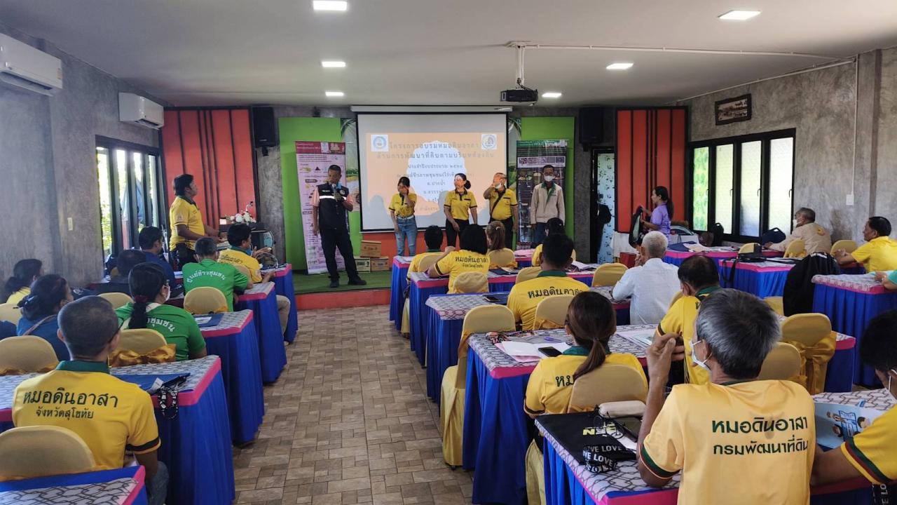 การพัฒนาศักยภาพของหมอดินอาสาด้านการพัฒนาที่ดินตามบริบทท้องถิ่น ประจำปีงบประมาณ 2568 โดยจัดอบรมในหัวข้อบทบาทและหน้าที่ของหมอดินอาสา เพื่อนำความรู้ที่ได้รับไปพัฒนาตนเองและชุมชน การอบรมเน้นในรูปแบบ บูรณาการ โดยให้หมอดินอาสาได้มีเวทีพบปะและรู้จักกัน ได้แลกเปลี่ยนความรู้ประสบการณ์ในการนำเทคโนโลยีในการพัฒนาที่ดินไปประยุกต์ใช้ให้เหมาะสมกับสภาพพื้นที่ร่วมกัน ตลอดจนนำองค์ความรู้ที่ได้รับไปประยุกต์สู่การปฏิบัติจริงและขยายผลสู่เครือข่ายและเกษตรกรทั่วไป พร้อมทั้งเสริมความรู้ด้านต่างๆ เช่น การจัดการดิน น้ำ ปุ๋ย และที่ดินให้ใช้ประโยชน์เพื่อการพัฒนาการเกษตรของตนเอง ผลิตอาหารและสร้างอาชีพได้ และการใช้สารเร่งซุปเปอร์ พด.ต่าง ๆของกรมพัฒนาที่ดิน ให้ความรู้ในการรายงานข่าวสารที่เกิดขึ้นในชุมชนของตนเองอย่างถูกต้องและเหมาะสม เพื่อให้เกิดประโยชน์ทั้งต่อตนเอง สังคม และหน่วยงานที่เกี่ยวข้อง ณ ศูนย์ชีวภาพชุมชนจังหวัดสุโขทัย (ไร่เทียนสว่าง) หมู่ 4 ตำบลปากน้ำ อำเภอสวรรคโลก จังหวัดสุโขทัย
