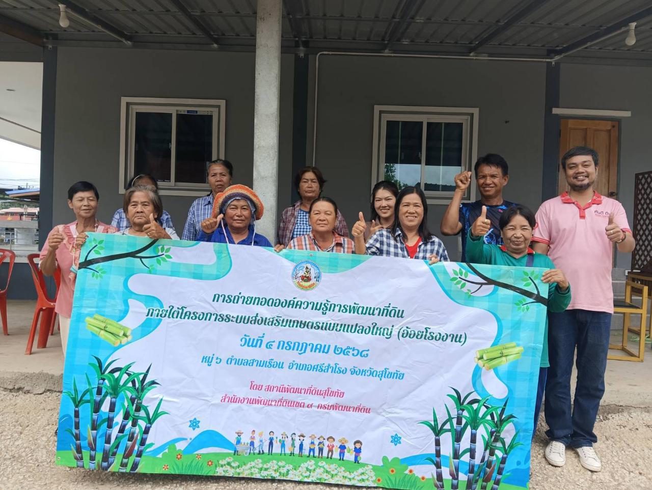 วันศุกร์ที่ 4 กรกฎาคม 2568 นายวิวรรธน์ภูมิ พรอำนวยลาภ ผู้อำนวยการสถานีพัฒนาที่ดินสุโขทัย มอบหมายให้ นายเอกพร นอบเผือก นักวิชาการเกษตรปฏิบัติการ ดำเนินโครงการระบบส่งเสริมเกษตรแบบแปลงใหญ่ ปี 2568 กิจกรรมถ่ายทอดองค์ความรู้ด้านการพัฒนาที่ดิน ให้กับสมาชิกเกษตรกรแปลงใหญ่อ้อย โดยมีหลักสูตรการถ่ายทอดเทคโนโลยี 4 รายวิชา ได้แก่ การวิเคราะห์ดิน การใช้ปุ๋ยตามค่าวิเคราะห์ดิน การจัดการดินและปุ๋ย การจัดการดินด้วยเทคโนโลยีชีวภาพ (สารเร่ง พด. ต่างๆ) การเข้าถึงสารสนเทศการใช้ประโยชน์ Application กรมฯ และสาธิตการไถกลบตอซัง เพื่อให้เกษตรกรได้นำความรู้ต่างๆ นำไปปรับใช้ในพื้นที่ของตนเองให้เกิดผลได้อย่างถูกต้อง สามารถลดต้นทุนเพิ่มผลผลิต ปรับปรุงบำรุงดินและการอนุรักษ์ดินและน้ำ ณ ที่ทำการแปลงใหญ่อ้อย หมู่ 6 ตำบลสามเรือน อำเภอศรีสำโรง จังหวัดสุโขทัย