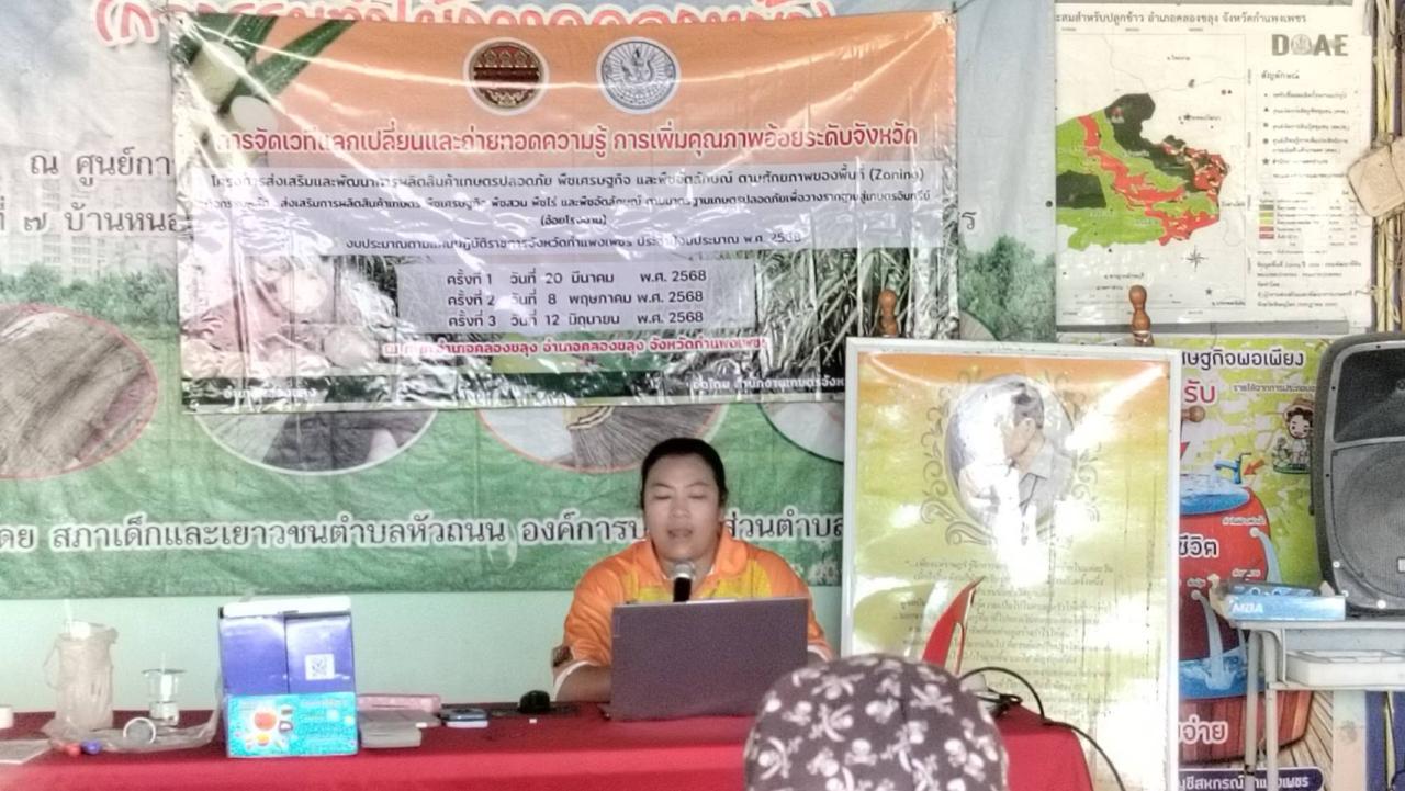 วันพฤหัสบดีที่ 8 พฤษภาคม 2568 นายเจษฎา สาระ ผู้อำนวยการสถานีพัฒนาที่ดินกำแพงเพชร มอบหมายให้นางสาวเกตน์นิภา คำสอน นักวิชาการเกษตรปฏิบัติการ พร้อมด้วยนายรักชาติ เพียรขำ เป็นวิทยากรถ่ายทอดความรู้การเพิ่มคุณภาพอ้อยระดับจังหวัด ภายใต้โครงการส่งเสริมและพัฒนาการผลิตสินค้าเกษตรปลอดภัย พืชเศรษฐกิจ และพืชอัตลักษณ์ ตามศักยภาพของพื้นที่ (Zoning) กิจกรรมหลัก : ส่งเสริมการผลิตสินค้าเกษตร พืชเศรษฐกิจ พืชสวน พืชไร่ และพืชอัตลักษณ์ ตามมาตรฐานเกษตรปบอดภัยเพื่อวางรากฐานสู่เกษตรอินทรีย์(อ้อยโรงงาน) โครงการตามแผนปฏิบัติราชการจังหวัดกำแพงเพชร ประจำปีงบประมาณ 2568 ในหัวข้อ 1.การจัดการดิน ความสำคัญของการตรวจวิเคราะห์ดิน 2. ผลของธาตุอาหารต่างๆกับการผลิตอ้อยโรงงาน 3. การใช้ปุ๋ย การผสมปุ๋ยตามค่ายวิเคราะห์ดิน ธาตุอาหารตามค่ายสิเคราะห์ดิน 4.การปรับปรุงดินจากวัสดุเหลือใช้จากเศษซากอ้อย ณ ศูนย์ ศพก.อำเภอคลองขลุง หมู่ที่ 7 บ้านหนองกระทุ่ม ตำบลหัวถนน อำเภอคลองขลุง จังหวัดกำแพงเพชร