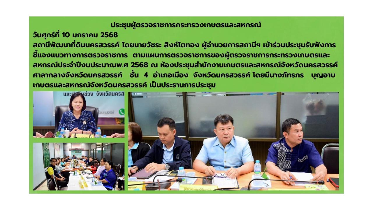 สถานีพัฒนาที่ดินนครสวรรค์ โดยนายวัชระ สิงห์โตทอง ผู้อำนวยการสถานีฯ เข้าร่วมประชุมรับฟังการชี้แจงแนวทางการตรวจราชการตามแผนการตรวจราชการของผู้ตรวจราชการกระทรวงเกษตรและสหกรณ์ประจำ ปีงบประมาณพ.ศ 2568 ณ ห้องประชุมสำนักงานเกษตรและสหกรณ์จังหวัดนครสวรรค์ศาลากลางจังหวัดนครสวรรค์ ชั้น 4 อำเภอเมือง จังหวัดนครสวรรค์ โดยมีนางภัทรภร บุญอาบ เกษตรและสหกรณ์จังหวัดนครสวรรค์ เป็นประธานการประชุม