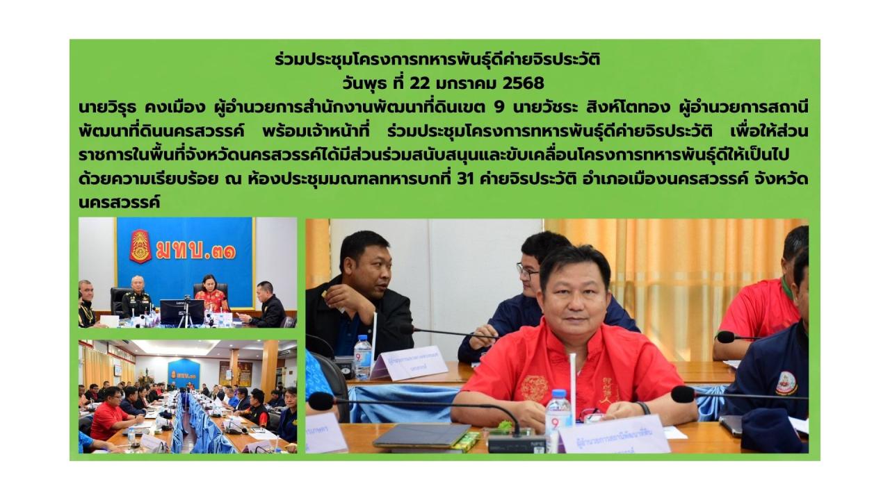 นายวิรุธ คงเมือง ผู้อำนวยการสำนักงานพัฒนาที่ดินเขต 9 นายวัชระ สิงห์โตทอง ผู้อำนวยการสถานีพัฒนาที่ดินนครสวรรค์ พร้อมเจ้าหน้าที่ ร่วมประชุมโครงการทหารพันธุ์ดีค่ายจิรประวัติ เพื่อให้ส่วนราชการในพื้นที่จังหวัดนครสวรรค์ได้มีส่วนร่วมสนับสนุนและขับเคลื่อนโครงการทหารพันธุ์ดีให้เป็นไปด้วยความเรียบร้อย ณ ห้องประชุมมณฑลทหารบกที่ 31 ค่ายจิรประวัติ อำเภอเมืองนครสวรรค์ จังหวัดนครสวรรค์