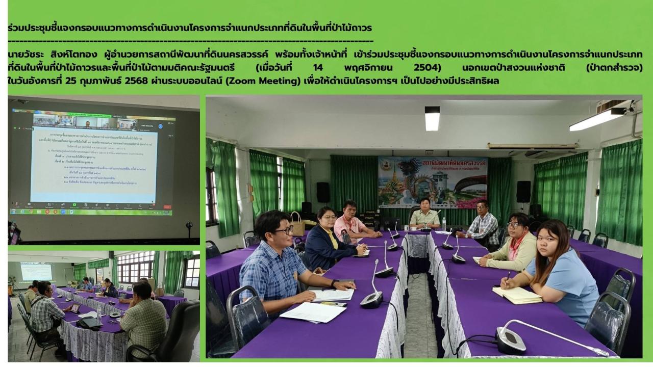 นายวัชระ สิงห์โตทอง ผู้อำนวยการสถานีพัฒนาที่ดินนครสวรรค์ พร้อมทั้งเจ้าหน้าที่ เข้าร่วมประชุมชี้แจงกรอบแนวทางการดำเนินงานโครงการจำแนกประเภทที่ดินในพื้นที่ป่าไม้ถาวรและพื้นที่ป่าไม้ตามมติคณะรัฐมนตรี (เมื่อวันที่ 14 พฤศจิกายน 2504) นอกเขตป่าสงวนแห่งชาติ (ป่าตกสำรวจ) ในวันอังคารที่ 25 กุมภาพันธ์ 2568 ผ่านระบบออนไลน์ (Zoom Meeting) เพื่อให้ดำเนินโครงการฯ เป็นไปอย่างมีประสิทธิผล