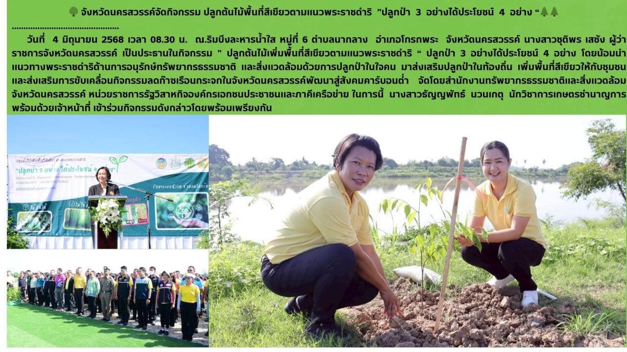 วันที่ 4 มิถุนายน 2568 เวลา 08.30 น. ณ.ริมบึงละหารน้ำใสหมู่ที่ 6 ตำบลนากลาง อำเภอโกรกพระ จังหวัดนครสวรรค์ นางสาวชุติพร เสชัง ผู้ว่าราชการจังหวัดนครสวรรค์ เป็นประธานในกิจกรรม ” ปลูกต้นไม้เพิ่มพื้นที่สีเขียวตามแนวพระราชดำริ “ ปลูกป่า 3 อย่างได้ประโยชน์ 4 อย่าง โดยน้อมนำแนวทางพระราชดำริด้านการอนุรักษ์ทรัพยากรธรรมชาติ และสิ่งแวดล้อมด้วยการปลูกป่าในใจคน มาส่งเสริมปลูกป่าในท้องถิ่น เพิ่มพื้นที่สีเขียวให้กับชุมชนและส่งเสริมการขับเคลื่อนกิจกรรมลดก๊าซเรือนกระจกในจังหวัดนครสวรรค์พัฒนาสู่สังคมคาร์บอนต่ำ จัดโดยสำนักงานทรัพยากรธรรมชาติและสิ่งแวดล้อมจังหวัดนครสวรรค์ หน่วยราชการรัฐวิสาหกิจองค์กรเอกชนประชาชนและภาคีเครือข่าย ในการนี้ นางสาวธัญญพัทธ์ นวนเกตุ นักวิชาการชำนาญการพร้อมด้วยเจ้าหน้าที่ เข้าร่วมกิจกรรมดังกล่าวโดยพร้อมเพรียงกัน