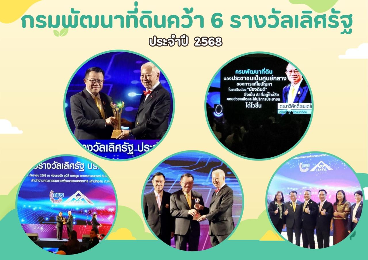 วันศุกร์ที่ 12 กันยายน พ.ศ. 2568 ดร.ทวีศักดิ์ ธนเดโชพล อธิบดีกรมพัฒนาที่ดิน พร้อมด้วย ดร.อาทิตย์ ศุขเกษม ดร.สุมิตรา วัฒนา และนายสุรชาติ มาลาศรี รองอธิบดีกรมพัฒนาที่ดิน และเจ้าหน้าที่ที่เกี่ยวข้อง เข้าร่วมรับรางวัลเลิศรัฐ ประจำปี 2568 ของสำนักงานคณะกรรมการพัฒนาระบบราชการ (ก.พ.ร.) จำนวน 6 รางวัล คือ (1) รางวัลเกียรติยศเลิศรัฐ ประจำปี 2568 ซึ่งเป็นรางวัลที่มอบให้แก่หน่วยงานที่มีความโดดเด่น ในการสร้างคุณค่า และสร้างสรรค์ผลงานการปฏิบัติราชการจนมีความสำเร็จอย่างต่อเนื่อง(2) สาขาคุณภาพการบริหารจัดการภาครัฐ ประเภทรางวัลคุณภาพการบริหารจัดการภาครัฐ 4.0 (PMQA 4.0) (3) สาขาคุณภาพการบริหารจัดการภาครัฐ ประเภทรางวัลคุณภาพการบริหารจัดการภาครัฐ รายหมวด หมวด 5 ด้านการบริหารทรัพยากรบุคคล (4) สาขาบริการภาครัฐ ประเภทบริการตอบโจทย์ตรงใจ ระดับดี จากผลงาน โครงสร้างดินตอบโจทย์ ด้วยงานจัดระบบอนุรักษ์ดินและน้ำ นวัตกรรม พด.เพิ่มผลผลิตตรงใจเกษตรกรตำบลหน้าไม้ สร้างรายได้อย่างยั่งยืน โดยสถานีพัฒนาที่ดินปทุมธานี สพข.1 (5) สาขาการบริหารราชการแบบมีส่วนร่วม ประเภทเลื่องลือขยายผล ระดับดี จากผลงาน รัฐราษฎร์ร่วมบูรณา หันคาทำนาลดต้นทุน เพิ่มพูน ผลผลิตสู่การพัฒนาที่ยั่งยืน โดยสถานีพัฒนาที่ดินชัยนาท สพข.1 (6) สาขาการบริหารราชการแบบมีส่วนร่วม ประเภทเลื่องลือขยายผล ระดับดี จากผลงาน ขยายผลต้นแบบ “กุสุมาลย์โมเดล : การพัฒนาสระน้ำใน ไร่นาแบบบูรณาการ พัฒนาคุณภาพชีวิตเกษตรกรอย่าง ยั่งยืน” โดยสถานีพัฒนาที่ดินสกลนคร สพข.5 โดยมี ศาสตราจารย์กิตติคุณ บวรศักดิ์ อุวรรณโณ เป็นประธานในพิธีมอบรางวัลเลิศรัฐ ประจําปี 2568 ณ ห้องรอยัล จูบิลี่ บอลรูม อาคารชาเลนเจอร์ อิมแพคเมืองทองธานี จังหวัดนนทบุรี