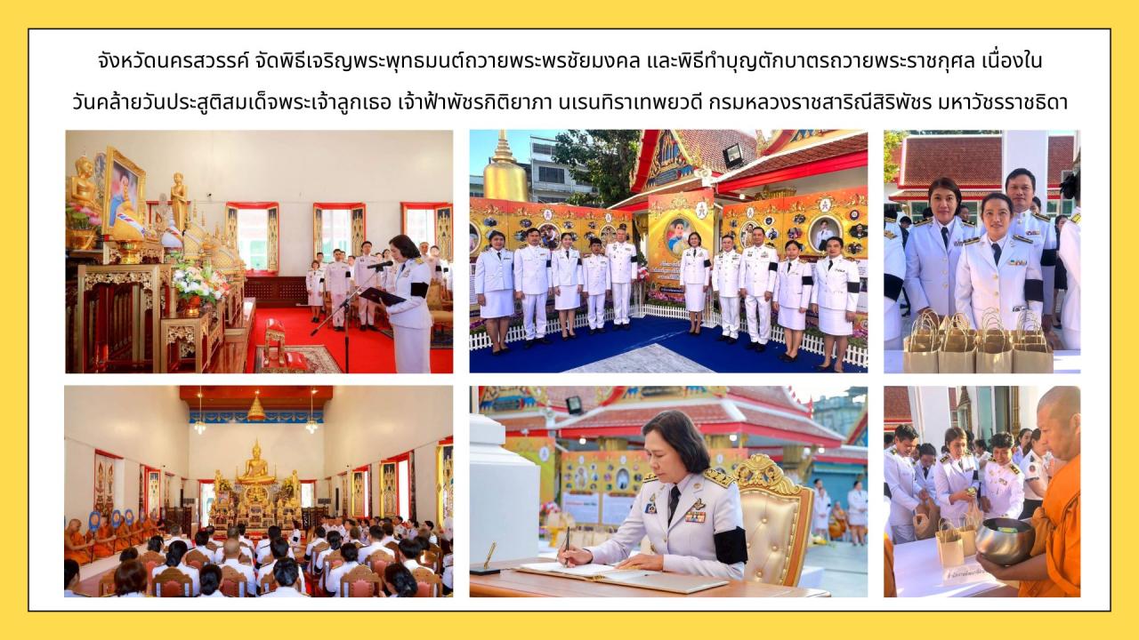 วันนี้ 7 ธันวาคม 2568 เวลา 07.00 น. นางสาวชุติพร เสชัง ผู้ว่าราชการจังหวัดนครสวรรค์ เป็นประธานในพิธีเจริญพระพุทธมนต์ถวายพระพรชัยมงคล และพิธีทำบุญตักบาตรถวายพระราชกุศล เนื่องในวันคล้ายวันประสูติสมเด็จพระเจ้าลูกเธอ เจ้าฟ้าพัชรกิติยาภา นเรนทิราเทพยวดี กรมหลวงราชสาริณีสิริพัชร มหาวัชรราชธิดา พร้อมทั้งกล่าวถวายพระพรชัยมงคล และกล่าวสำนึกในพระกรุณาธิคุณที่ทรงประกอบพระกรณียกิจนานัปการในด้านต่าง ๆ เพื่อแสดงความจงรักภักดี และวางพุ่มดอกไม้สด ถวายราชสักการะโดยมีหัวหน้าส่วนราชการ อัยการ ศาล ทหาร ตำรวจ และประชาชน ในการนี้ สำนักงานพัฒนาที่ดินเขต 9 โดยนางมาลัยรัช น้อยแสง ผู้อำนวยการกลุ่มวิเคราะห์ดิน และสถานีพัฒนาที่ดินนครสวรรค์ โดยนายทศพล แก้วลือ นักวิชาการเกษตรชำนาญการ พร้อมด้วยเจ้าหน้าที่ เข้าร่วมพิธีโดยพร้อมเพรียงกัน ณ พระอุโบสถ วัดนครสวรรค์ พระอารามหลวง จังหวัดนครสวรรค์
