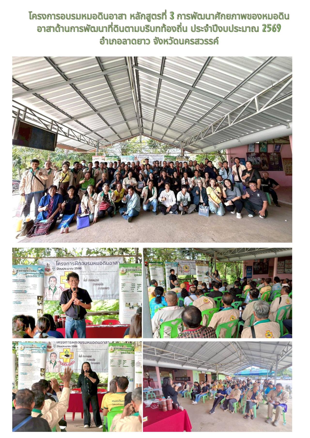 วันที่ 23 ธันวาคม 2568 สถานีพัฒนาที่ดินนครสวรรค์ โดยนายประสงค์ จันทร์สุวรรณ นักวิชาการเกษตรชำนาญการพิเศษ และนางสาวฐานีย์ สุขาวิญญา นักวิชาการเกษตร พร้อมด้วยกลุ่มวิชาการเพื่อการพัฒนาที่ดิน โดยนางสาวกมลวรรณ ทองอ่อน นักวิชาการเกษตร ดำเนินการโครงการอบรมหมอดินอาสา หลักสูตรที่ 3 การพัฒนาศักยภาพของหมอดินอาสาด้านการพัฒนาที่ดินตามบริบทท้องถิ่น ประจำปีงบประมาณ 2569 เพื่อให้หมอดินอาสาได้เรียนรู้เทคโนโลยีในการพัฒนาที่ดินที่เหมาะสมกับสภาพพื้นที่ และแลกเปลี่ยนเรียนรู้การแก้ไขปัญหาด้านดินจากประสบการณ์ในการทำการเกษตรของตนเอง ณ กลุ่มนาแปลงใหญ่บ้านห้วยน้ำหอม อ.ลาดยาว จ.นครสวรรค์