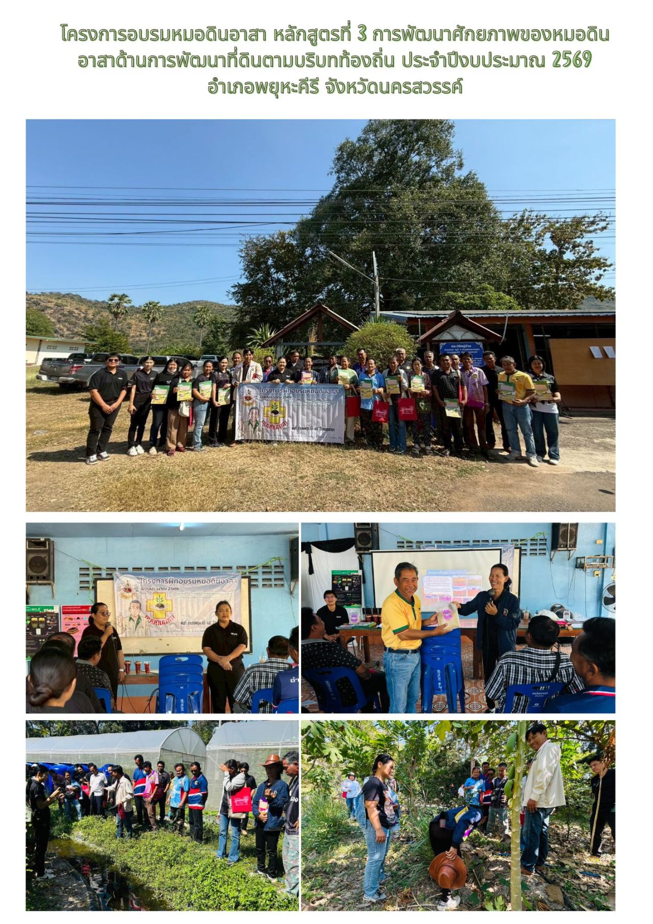 วันที่ 25 ธันวาคม 2568 สถานีพัฒนาที่ดินนครสวรรค์ โดย นางสาวกนกลดา เวียงจันทร์ นักวิชาการเกษตรปฏิบัติการ พร้อมด้วยเจ้าหน้าที่ ดำเนินโครงการอบรมหมอดินอาสา หลักสูตรที่ 3 การพัฒนาศักยภาพของหมอดินอาสาด้านการพัฒนาที่ดินตามบริบทท้องถิ่น ประจำปีงบประมาณ 2569 เพื่อให้หมอดินอาสาได้เรียนรู้เทคโนโลยีในการพัฒนาที่ดินที่เหมาะสมกับสภาพพื้นที่ และแลกเปลี่ยนเรียนรู้การแก้ไขปัญหาด้านดินจากประสบการณ์ในการทำการเกษตรของตนเอง ในการนี้ ได้รับเกียรติจาก นางราตรี บัวพนัส เกษตรกรดีเด่นแห่งชาติ ประจำปี 2568 สาขาการพัฒนาที่ดิน มาบรรยายให้ความรู้ การจัดการพื้นที่ทำเกษตรแบบผสมผสานและการประยุกต์ใช้นวัตกรรมต่าง ๆ ของกรมพัฒนาที่ดิน ในการปรับปรุงบำรุงดิน พร้อมทั้งให้ความรู้ในการทำเกษตรอินทรีย์ ณ ศูนย์เรียนรู้ เศรษฐกิจพอเพียงบ้านบ่อทอง ตำบลนิคมเขาบ่อแก้ว อำเภอพยุหะคีรี จังหวัดนครสวรรค์