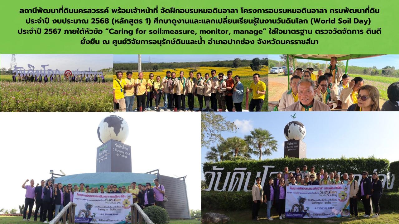 นายวัชระ สิงห์โตทอง ผู้อำนวยการสถานีพัฒนาที่ดินนครสวรรค์ พร้อมเจ้าหน้าที่ จัดฝึกอบรมหมอดินอาสา โครงการอบรมหมอดินอาสา กรมพัฒนาที่ดิน ประจำปี งบประมาณ 2568 (หลักสูตร 1) ศึกษาดูงานและแลกเปลี่ยนเรียนรู้ในงานวันดินโลก (World Soil Day) ประจำปี 2567 ภายใต้หัวข้อ “Caring for soil:measure, monitor, manage” ใส่ใจมาตรฐาน ตรวจวัดจัดการ ดินดียั่งยืน ณ ศูนย์วิจัยการอนุรักษ์ดินและน้ำ อำเภอปากช่อง จังหวัดนครราชสีมา
