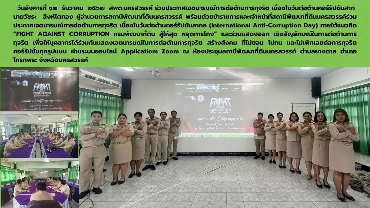 นายวัชระ สิงห์โตทอง ผู้อำนวยการสถานีพัฒนาที่ดินนครสวรรค์ พร้อมด้วยข้าราชการและเจ้าหน้าที่สถานีพัฒนาที่ดินนครสวรรค์ร่วมประกาศเจตนารมณ์การต่อต้านการทุจริต เนื่องในวันต่อต้านคอร์รัปชันสากล (International Anti-Corruption Day) ภายใต้แนวคิด “FIGHT AGAINST CORRUPTION กรมพัฒนาที่ดิน สู้ให้สุด หยุดการโกง” และร่วมแสดงออก เชิงสัญลักษณ์ในการต่อต้านการทุจริต เพื่อให้บุคลากรได้ร่วมกันแสดงเจตนารมณ์ในการต่อต้านการทุจริต สร้างสังคม ที่ไม่ยอม ไม่ทน และไม่เพิกเฉยต่อการทุจริตคอร์รัปชั่นทุกรูปแบบ ผ่านระบบออนไลน์ Applicatiom Zoom ณ ห้องประชุมสถานีพัฒนาที่ดินนครสวรรค์ ตำบลยางตาล อำเภอโกรกพระ จังหวัดนครสวรรค์