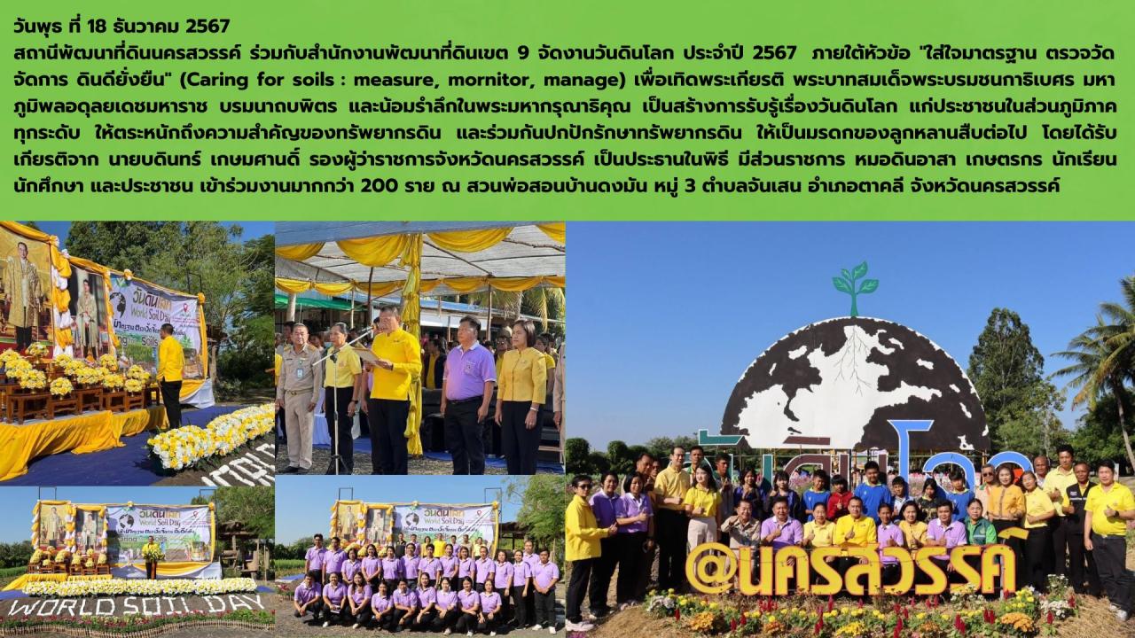 สถานีพัฒนาที่ดินนครสวรรค์ ร่วมกับสำนักงานพัฒนาที่ดินเขต 9 จัดงานวันดินโลก ประจำปี 2567 ภายใต้หัวข้อ "ใส่ใจมาตรฐาน ตรวจวัดจัดการ ดินดียั่งยืน" (Caring for soils : measure, mornitor, manage) เพื่อเทิดพระเกียรติ พระบาทสมเด็จพระบรมชนกาธิเบศร มหาภูมิพลอดุลยเดชมหาราช บรมนาถบพิตร และน้อมรำลึกในพระมหากรุณาธิคุณ เป็นสร้างการรับรู้เรื่องวันดินโลก แก่ประชาชนในส่วนภูมิภาคทุกระดับ ให้ตระหนักถึงความสำคัญของทรัพยากรดิน และร่วมกันปกปักรักษาทรัพยากรดิน ให้เป็นมรดกของลูกหลานสืบต่อไป โดยได้รับเกียรติจาก นายบดินทร์ เกษมศานดิ์ รองผู้ว่าราชการจังหวัดนครสวรรค์ เป็นประธานในพิธี มีส่วนราชการ หมอดินอาสา เกษตรกร นักเรียน นักศึกษา และประชาชน เข้าร่วมงานมากกว่า 200 ราย ณ สวนพ่อสอนบ้านดงมัน หมู่ 3 ตำบลจันเสน อำเภอตาคลี จังหวัดนครสวรรค์