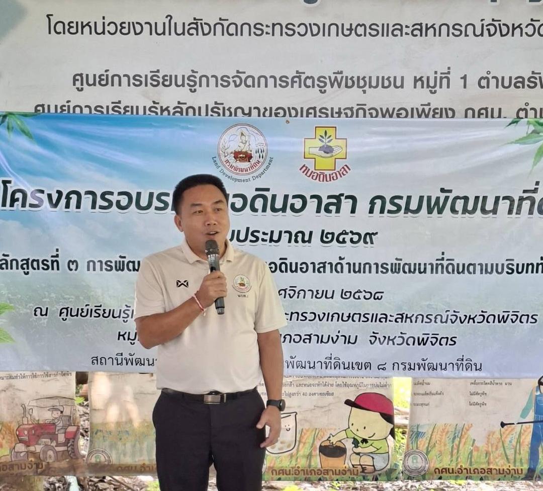สถานีพัฒนาที่ดินพิจิตร โดยนายมนต์ชัย พรมลอองวัน ผู้อำนวยการสถานีพัฒนาที่ดินพิจิตร และนายกีรติกร ฤทธิเกรียง นักวิชาการเกษตรชำนาญการ พร้อมเจ้าหน้าที่ฯ จัดอบรมหมอดินอาสา หลักสูตรที่ 3 การพัฒนาศักยภาพของหมอดินอาสาด้านการพัฒนาที่ดินตามบริบทท้องถิ่น และการถอดบทเรียนจากหมอดินอาสา จำนวน 25 ราย ณ ศูนย์เรียนรู้เกษตรทฤษฎีใหม่ หมู่ที่ 1 ตำบลรังนก อำเภอสามง่าม จังหวัดพิจิตร