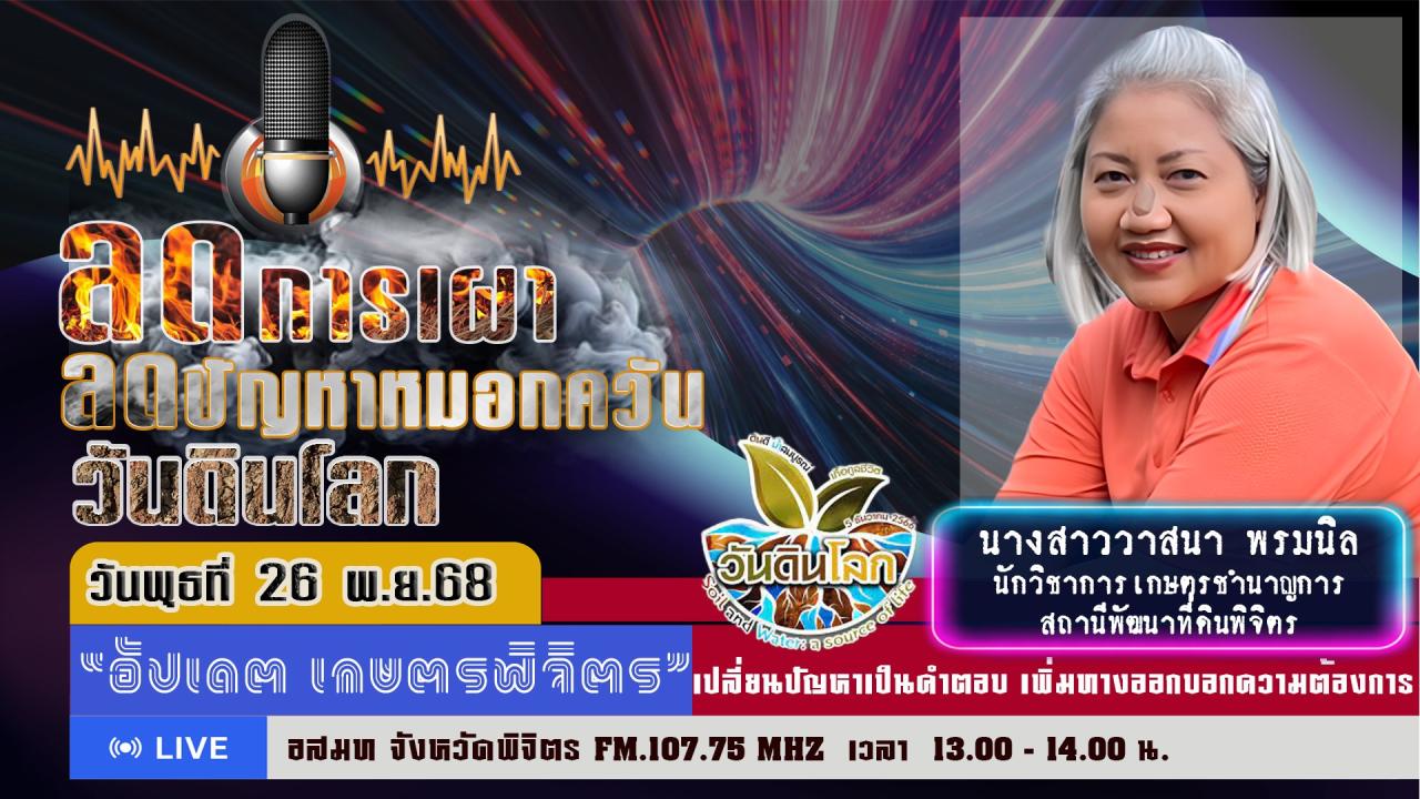 สถานีพัฒนาที่ดินพิจิตร โดยนายมนต์ชัย พรมลอองวัน ผู้อำนวยการสถานีพัฒนาที่ดินพิจิตร มอบหมายให้ นางสาววาสนา พรมนิล นักวิชาการเกษตรชำนาญการ ประชาสัมพันธ์ ลดการเผา ลดปัญหาหมอกควัน และเชิญชวนร่วมงานวันดินโลก ในรายการ "อัปเดต เกษตรพิจิตร" เปลี่ยนปัญหาเป็นคำตอบ เพิ่มทางออกบอกความต้องการ ณ อสมท. จังหวัดพิจิตร FM. 107.75 MHZ