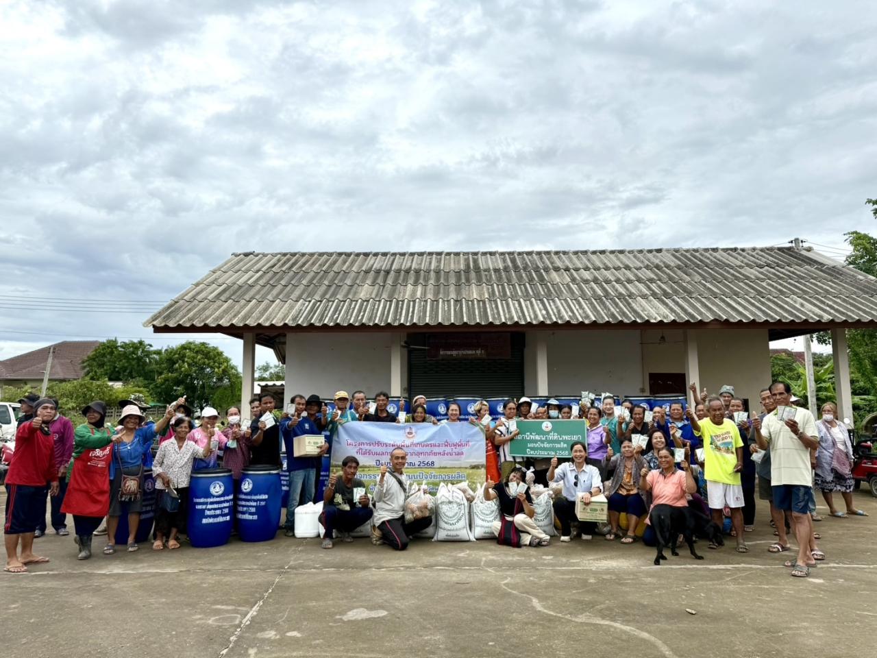 มอบปัจจัยการผลิตพร้อมทั้งสาธิตการผลิตน้ำหมักชีวภาพ พด.2 ให้กับเกษตรกรที่เข้าร่วมโครงการปรับระดับพื้นที่เกษตรกรและฟื้นฟูพื้นที่ที่ได้รับผลกระทบจากอุทกภัยหลังน้ำลด