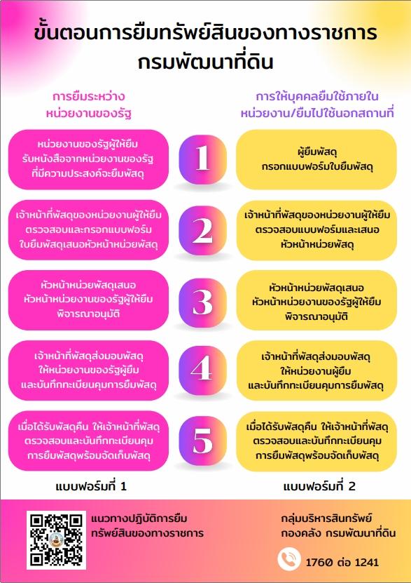 ขั้นตอนการยืมทรัพย์สินของทางราชการ กรมพัฒนาที่ดิน จัดทำขึ้นเพื่อให้หน่วยในงานสังกัดกรมพัฒนาที่ดินทราบหลักเกณฑ์และแนวทางปฏิบัติการยืมทรัพย์สินของทางราชการ เพื่อป้องกันความเสียหายและการสูญหายของทรัพย์สินทางราชการ