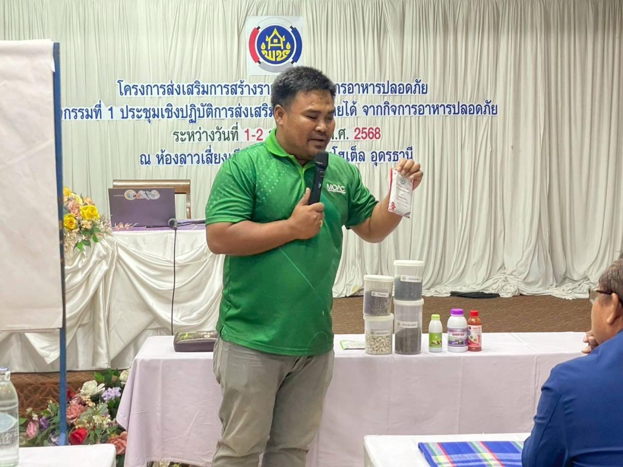 โดยมีวัตถุประสงค์ เพิ่อสร้างความรู้ ความเข้าใจ กลุ่มเป้าหมายในการสร้างรายได้กิจการอาหารปลอดภัยเพื่อจัดทำแผนพัฒนาต่อยอด และเชื่อมโยงช่องทางการตลาดอาหารปลอดภัย โดยกลุ่มเป้าหมาย ประกอบด้วย ผู้ผลิต ผู้ประกอบการ OTP หรือกลุ่มอาชีพจากฐานข้อมูลพัฒนาเศรษฐกิจฐานราก และประชารัฐที่มีศักยภาพในการพัฒนาสินค้าสู่กิจการอาหารปลอดภัย ใน 3 กลุ่มงาน ได้แก่ เกษตร แปรรูป ท่องเที่ยวโดยชุมชน จำนวน 20 ราย ณ โรงแรมเจริญโฮเต็ล อำเภอเมือง จังหวัดอุดรธานี
