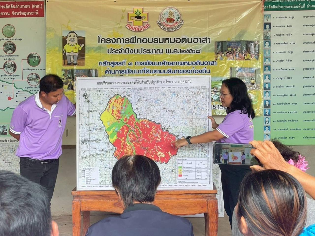 นางสาวทัณฑิกา มุงคุณคำ ชาว นักวิชาการเกษตรชำนาญการพิเศษ และนายเศรษฐพร เพชรนาวา นักวิชาการเกษตรปฏิบัติการ พร้อมเจ้าหน้าที่สถานีพัฒนาที่ดินอุดรธานี จัดอบรมหมอดินอาสาหลักสูตร ๓