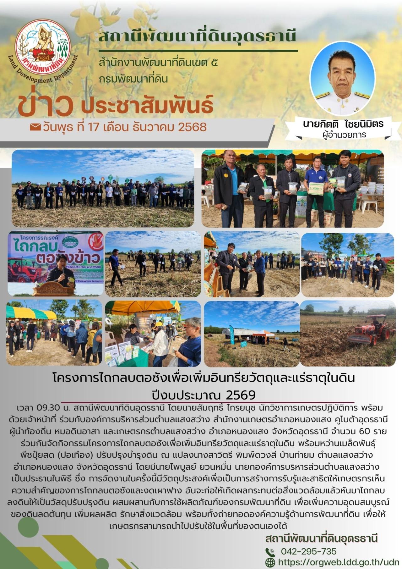 เวลา 09.30 น. สถานีพัฒนาที่ดินอุดรธานี โดยนายสัมฤทธิ์ ไกรยนุช นักวิชาการเกษตรปฏิบัติการ พร้อมด้วยเจ้าหน้าที่ ร่วมกับองค์การบริหารส่วนตำบลแสงสว่าง สำนักงานเกษตรอำเภอหนองแสง คูโบต้าอุดรธานี ผู้นำท้องถิ่น หมอดินอาสา และเกษตรกรตำบลแสงสว่าง อำเภอหนองแสง จังหวัดอุดรธานี จำนวน 60 ราย ร่วมกันจัดกิจกรรมโครงการไถกลบตอซังเพื่อเพิ่มอินทรียวัตถุและแร่ธาตุในดิน พร้อมหว่านเมล็ดพันธุ์พืชปุ๋ยสด (ปอเทือง) ปรับปรุงบำรุงดิน ณ แปลงนางสาวิตรี พิมพ์ดวงสี บ้านท่ายม ตำบลแสงสว่าง อำเภอหนองแสง จังหวัดอุดรธานี โดยมีนายไพบูลย์ ยวนหมื่น นายกองค์การบริหารส่วนตําบลแสงสว่าง เป็นประธานในพิธี ซึ่ง การจัดงานในครั้งนี้มีวัตถุประสงค์เพื่อเป็นการสร้างการรับรู้และสาธิตให้เกษตรกรเห็นความสำคัญของการไถกลบตอซังและงดเผาฟาง อันจะก่อให้เกิดผลกระทบต่อสิ่งแวดล้อมแล้วหันมาไถกลบลงดินให้เป็นวัสดุปรับปรุงดิน ผสมผสานกับการใช้ผลิตภัณฑ์ของกรมพัฒนาที่ดิน เพื่อเพิ่มความอุดมสมบูรณ์ของดิน ลดต้นทุน เพิ่มผลผลิต รักษาสิ่งแวดล้อม
