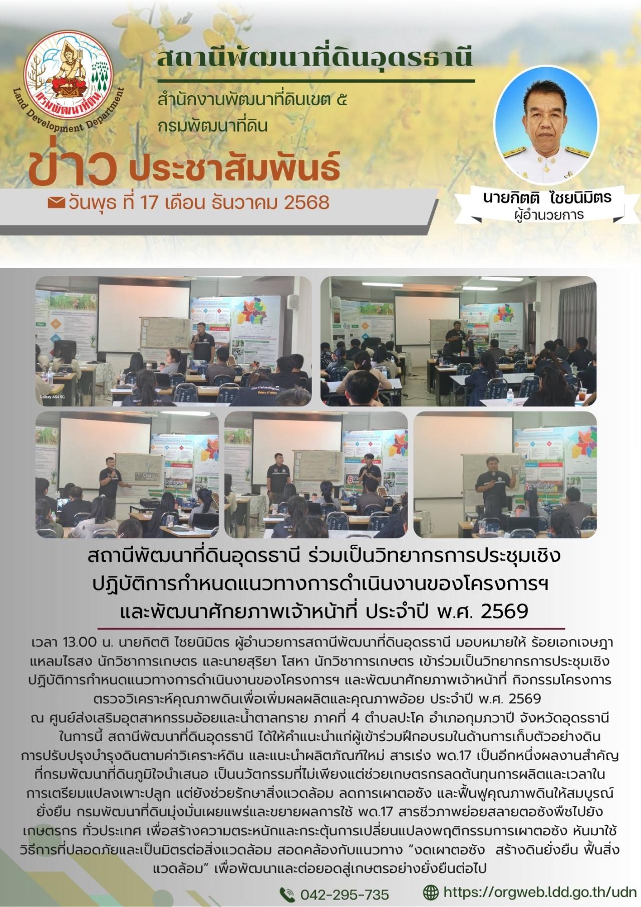 เวลา 13.00 น. นายกิตติ ไชยนิมิตร ผู้อำนวยการสถานีพัฒนาที่ดินอุดรธานี มอบหมายให้ ร้อยเอกเจษฎา แหลมไธสง นักวิชาการเกษตร และนายสุริยา โสหา นักวิชาการเกษตร เข้าร่วมเป็นวิทยากรการประชุมเชิงปฏิบัติการกำหนดแนวทางการดำเนินงานของโครงการฯ และพัฒนาศักยภาพเจ้าหน้าที่ กิจกรรมโครงการตรวจวิเคราะห์คุณภาพดินเพื่อเพิ่มผลผลิตและคุณภาพอ้อย ประจำปี พ.ศ. 2569 ณ ศูนย์ส่งเสริมอุตสาหกรรมอ้อยและน้ำตาลทราย ภาคที่ 4 ตำบลปะโค อำเภอกุมภวาปี จังหวัดอุดรธานี