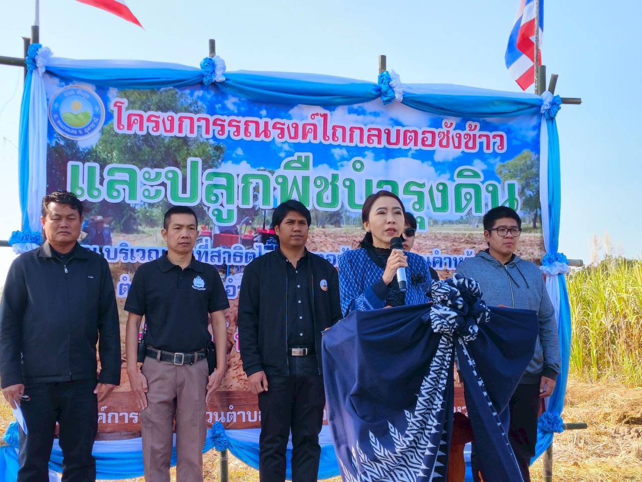เวลา 09.30 น. สถานีพัฒนาที่ดินอุดรธานี โดยนายสัมฤทธิ์ ไกรยนุช นักวิชาการเกษตรปฏิบัติการ พร้อมด้วยเจ้าหน้าที่ ร่วมกับ องค์การบริหารส่วนตำบลทับกุง สำนักงานเกษตรอำเภอหนองแสง ผู้นำท้องถิ่น หมอดินอาสา และเกษตรกรตำบลทับกุง อำเภอหนองแสง จังหวัดอุดรธานี จำนวน 60 ราย ร่วมกันจัดกิจกรรมโครงการไถกลบตอซังเพื่อเพิ่มอินทรียวัตถุและแร่ธาตุในดิน พร้อมหว่านเมล็ดพันธุ์พืชปุ๋ยสด (ปอเทือง) ปรับปรุงบำรุงดิน ณ แปลงสาธิต หมู่ที่ 9 บ้านคำหว้าทอง ตำบลทับกุง อำเภอหนองแสง จังหวัดอุดรธานี โดยมีนางสาวภาวิณี พลนิกรกิจ นายอำเภอหนองแสง เป็นประธานในพิธี ซึ่งการจัดงานในครั้งนี้มีวัตถุประสงค์เพื่อเป็นการสร้างการรับรู้และสาธิตให้เกษตรกรเห็นความสำคัญของการไถกลบตอซังและงดเผาฟาง อันจะก่อให้เกิดผลกระทบต่อสิ่งแวดล้อมแล้วหันมาไถกลบลงดินให้เป็นวัสดุปรับปรุงดิน ผสมผสานกับการใช้ผลิตภัณฑ์ของกรมพัฒนาที่ดิน เพื่อเพิ่มความอุดมสมบูรณ์ของดิน ลดต้นทุน เพิ่มผลผลิต รักษาสิ่งแวดล้อม