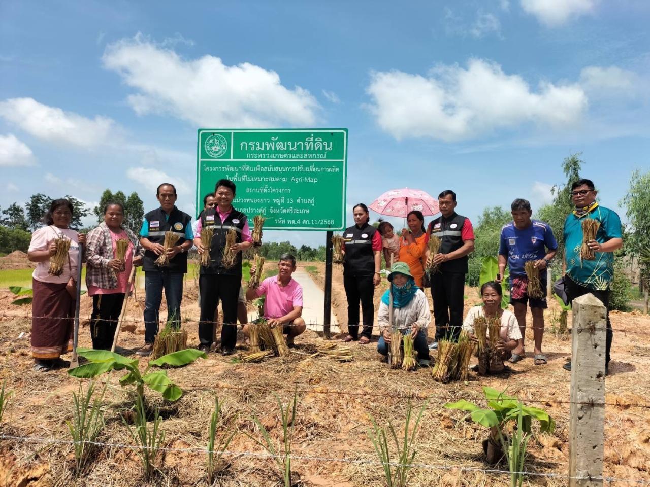 ตำแหน่งเจ้าพนักงานการเกษตรปฏิบัติงาน ร่วมกับนายกองค์การบริหารส่วนตำบลกู่ อำเภอปรางค์กู่จังหวัดศรีสะเกษ มอบหญ้าแฝกเพื่อส่งเสริมและร่วมปลูกหญ้าแฝกในแปลงเกษตรกร ในโครงการ พัฒนาที่ดินเพื่อสนับสนุนการปรับเปลี่ยนในพื้นที่ไม่เหมาะสมตาม Agi-Map ปี งบประมาณ ปี 2568 บ้านม่วงหนองยาว ตำบลกู่ อำเภอปรางค์กู่ จังหวัดศรีสะเกษ เพื่อป้องกันการชะล้างพังทลายของดินและเพื่อการอนุรักษ์ดินและน้ำ