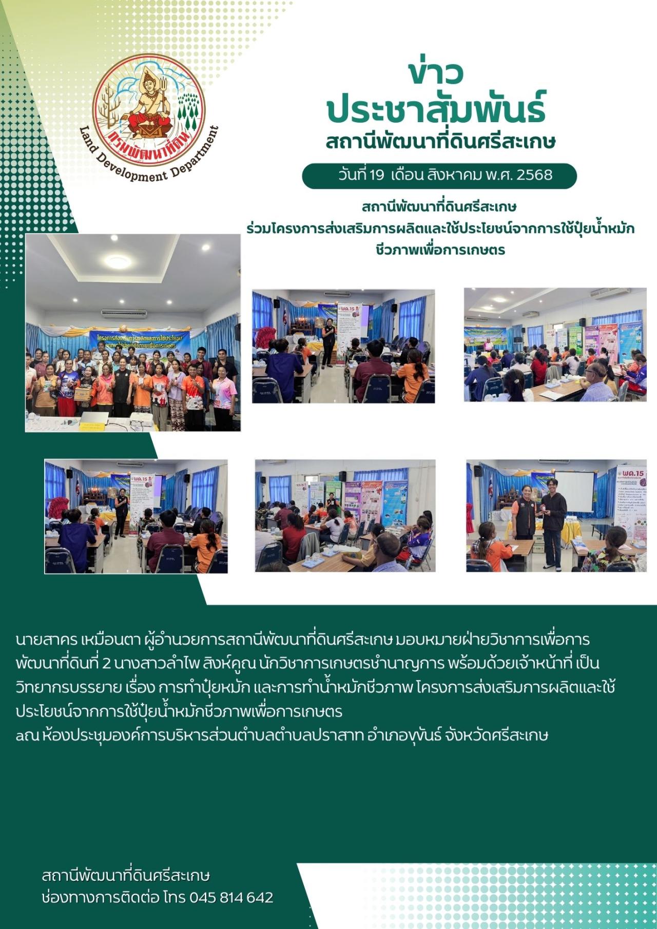 นายสาคร เหมือนตา ผู้อำนวยการสถานีพัฒนาที่ดินศรีสะเกษ มอบหมายฝ่ายวิชาการเพื่อการพัฒนาที่ดินที่ 2 นางสาวลำไพ สิงห์คูณ นักวิชาการเกษตรชำนาญการ พร้อมด้วยเจ้าหน้าที่ เป็นวิทยากรบรรยาย เรื่อง การทำปุ๋ยหมัก และการทำน้ำหมักชีวภาพ โครงการส่งเสริมการผลิตและใช้ประโยชน์จากการใช้ปุ๋ยน้ำหมักชีวภาพเพื่อการเกษตร