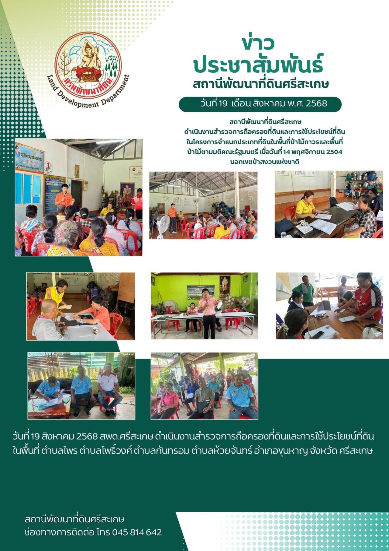 วันที่ 19 สิงหาคม 2568 สพด.ศรีสะเกษ ดำเนินงานสำรวจการถือครองที่ดินและการใช้ประโยชน์ที่ดิน ในพื้นที่ ตำบลไพร ตำบลโพธิ์วงศ์ ตำบลกันทรอม ตำบลห้วยจันทร์ อำเภอขุนหาญ จังหวัด ศรีสะเกษ