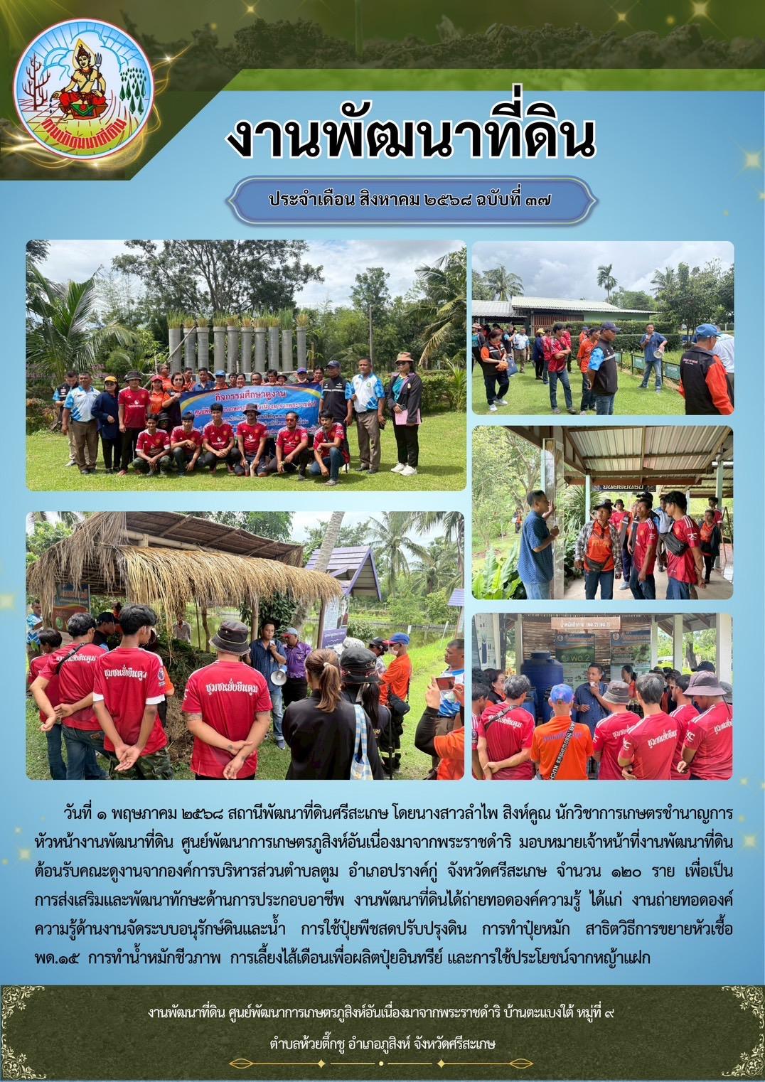 โดยนางสาวลำไพ สิงห์คูณ นักวิชาการเกษตรชำนาญการ หัวหน้างานพัฒนาที่ดิน ศูนย์พัฒนาการเกษตรภูสิงห์อันเนื่องมาจากพระราชดำริ มอบหมายเจ้าหน้าที่งานพัฒนาที่ดินต้อนรับคณะดูงานจากองค์การบริหารส่วนตำบลตูม อำเภอปรางค์กู่ จังหวัดศรีสะเกษ จำนวน ๑๒๐ ราย เพื่อเป็นการส่งเสริมและพัฒนาทักษะด้านการประกอบอาชีพ งานพัฒนาที่ดินได้ถ่ายทอดองค์ความรู้ ได้แก่ งานถ่ายทอดองค์ความรู้ด้านงานจัดระบบอนุรักษ์ดินและน้ำ การใช้ปุ๋ยพืชสดปรับปรุงดิน การทำปุ๋ยหมัก สาธิตวิธีการขยายหัวเชื้อ พด.๑๕ การทำน้ำหมักชีวภาพ การเลี้ยงไส้เดือนเพื่อผลิตปุ๋ยอินทรีย์ และการใช้ประโยชน์จากหญ้าแฝก