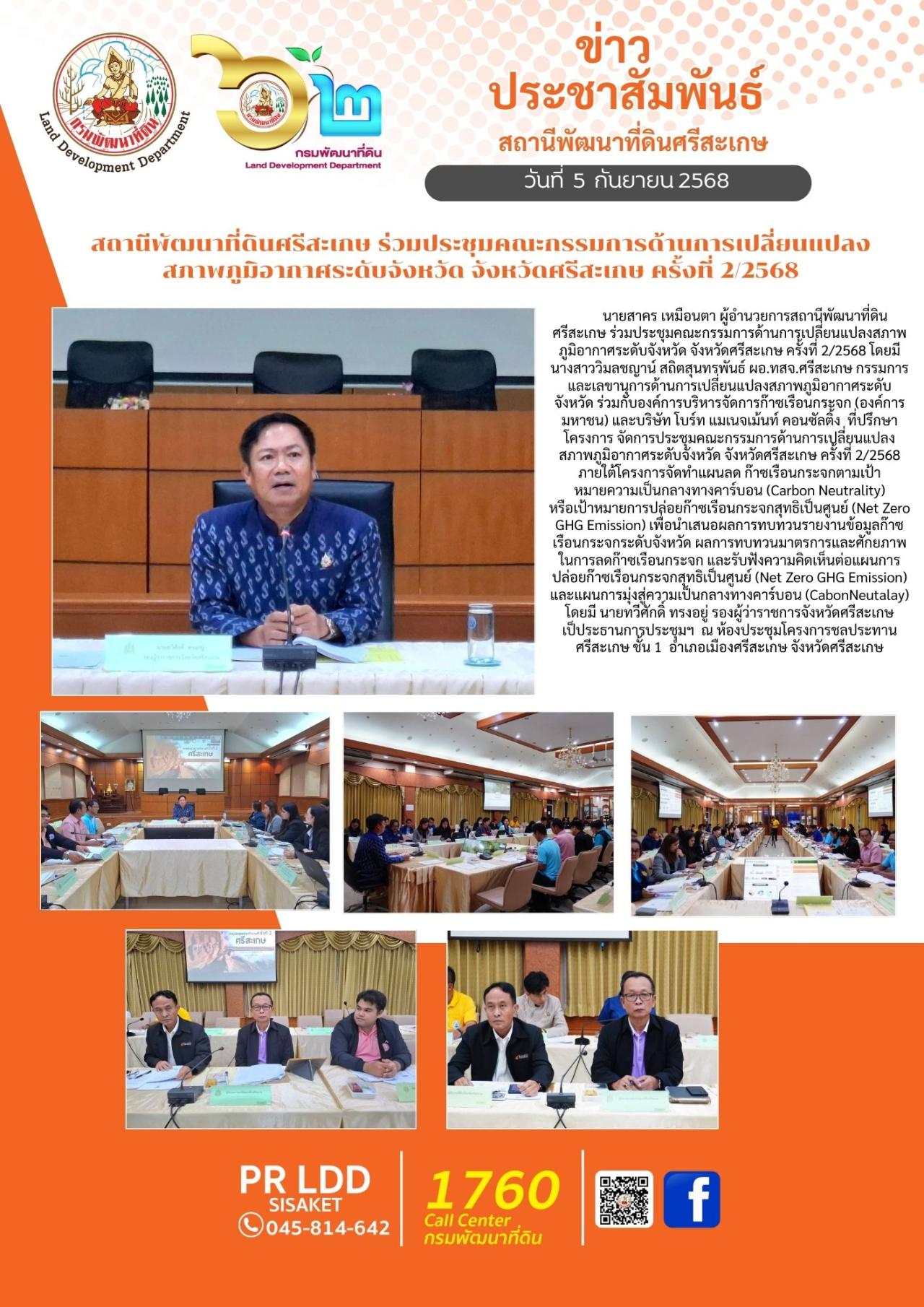 นายสาคร เหมือนตา ผู้อำนวยการสถานีพัฒนาที่ดินศรีสะเกษ ร่วมประชุมคณะกรรมการด้านการเปลี่ยนแปลงสภาพภูมิอากาศระดับจังหวัด จังหวัดศรีสะเกษ ครั้งที่ 2/2568 โดยมี นางสาววิมลชญาน์ สถิตสุนทรพันธ์ ผอ.ทสจ.ศรีสะเกษ กรรมการและเลขานุการด้านการเปลี่ยนแปลงสภาพภูมิอากาศระดับจังหวัด ร่วมกับองค์การบริหารจัดการก๊าซเรือนกระจก (องค์การมหาชน) และบริษัท โบร์ท แมเนจเม้นท์ คอนซัลติ้ง ที่ปรึกษาโครงการ จัดการประชุมคณะกรรมการด้านการเปลี่ยนแปลงสภาพภูมิอากาศระดับจังหวัด จังหวัดศรีสะเกษ ครั้งที่ 2/2568 ภายใต้โครงการจัดทำแผนลด ก๊าซเรือนกระจกตามเป้าหมายความเป็นกลางทางคาร์บอน (Carbon Neutrality) หรือเป้าหมายการปล่อยก๊าซเรือนกระจกสุทธิเป็นศูนย์ (Net Zero GHG Emission) เพื่อนำเสนอผลการทบทวนรายงานข้อมูลก๊าซเรือนกระจกระดับจังหวัด ผลการทบทวนมาตรการและศักยภาพในการลดก๊าซเรือนกระจก และรับฟังความคิดเห็นต่อแผนการปล่อยก๊าซเรือนกระจกสุทธิเป็นศูนย์ (Net Zero GHG Emission) และแผนการมุ่งสู่ความเป็นกลางทางคาร์บอน (CabonNeutalay) โดยมี นายทวีศักดิ์ ทรงอยู่ รองผู้ว่าราชการจังหวัดศรีสะเกษเป็นประธานการประชุมฯ ณ ห้องประชุมโครงการชลประทานศรีสะเกษ ชั้น 1 อำเภอเมืองศรีสะเกษ จังหวัดศรีสะเกษ